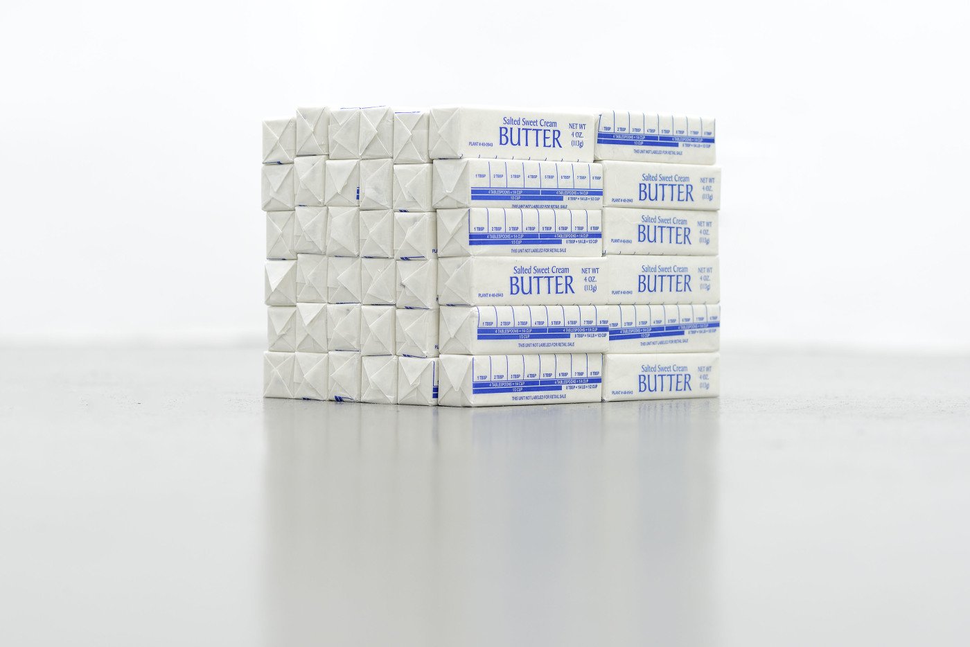 - Nick Darmstaedter, I Could Dance Forever! Oh, My Hemorrhoid, 2014, Italian marble, 72 salted sweet cream butter stick wrappers, dimensions variable.