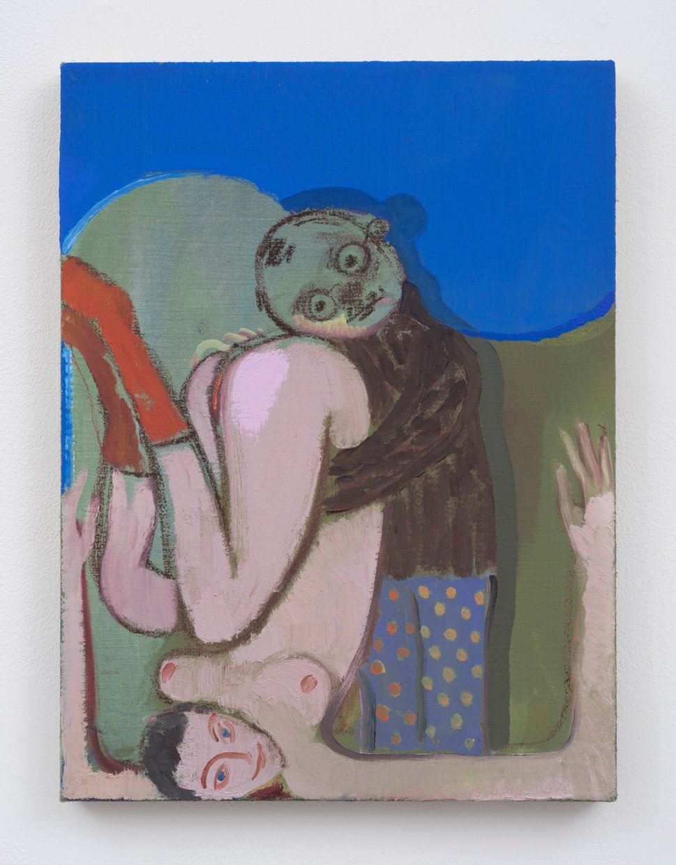 Adam Gilder, who died of brain cancer at the age of thirty-six, wrote hundreds of short pieces with obsessive care for words, most of which were collected after his death in 2007 and published in a book called Another Ventriloquist (2011, J&L Books). The title figure of a storyteller sharing tales through an inanimate third party in between him or her and the public, brings us to speak about the medium and how this is able to formally intermediate. While in the case of Gilders it is the special use of jumps in the language, scarcity and the dense significance of every word, the formal quality of Kantarovsky’s paintings resides in the meaningful and narrative use of different techniques on the same canvas. Taking Blue Agency for example, we see one of the characters being somehow oppressed by the other and so painted with soft rough pastel marks whereas the weighty oil paint is used to enhance the sense of strength borne by the oppressor. At the same time, the linen of the canvas is left untreated to highlight both techniques by contrasting the painted parts with the weave of the fabric.