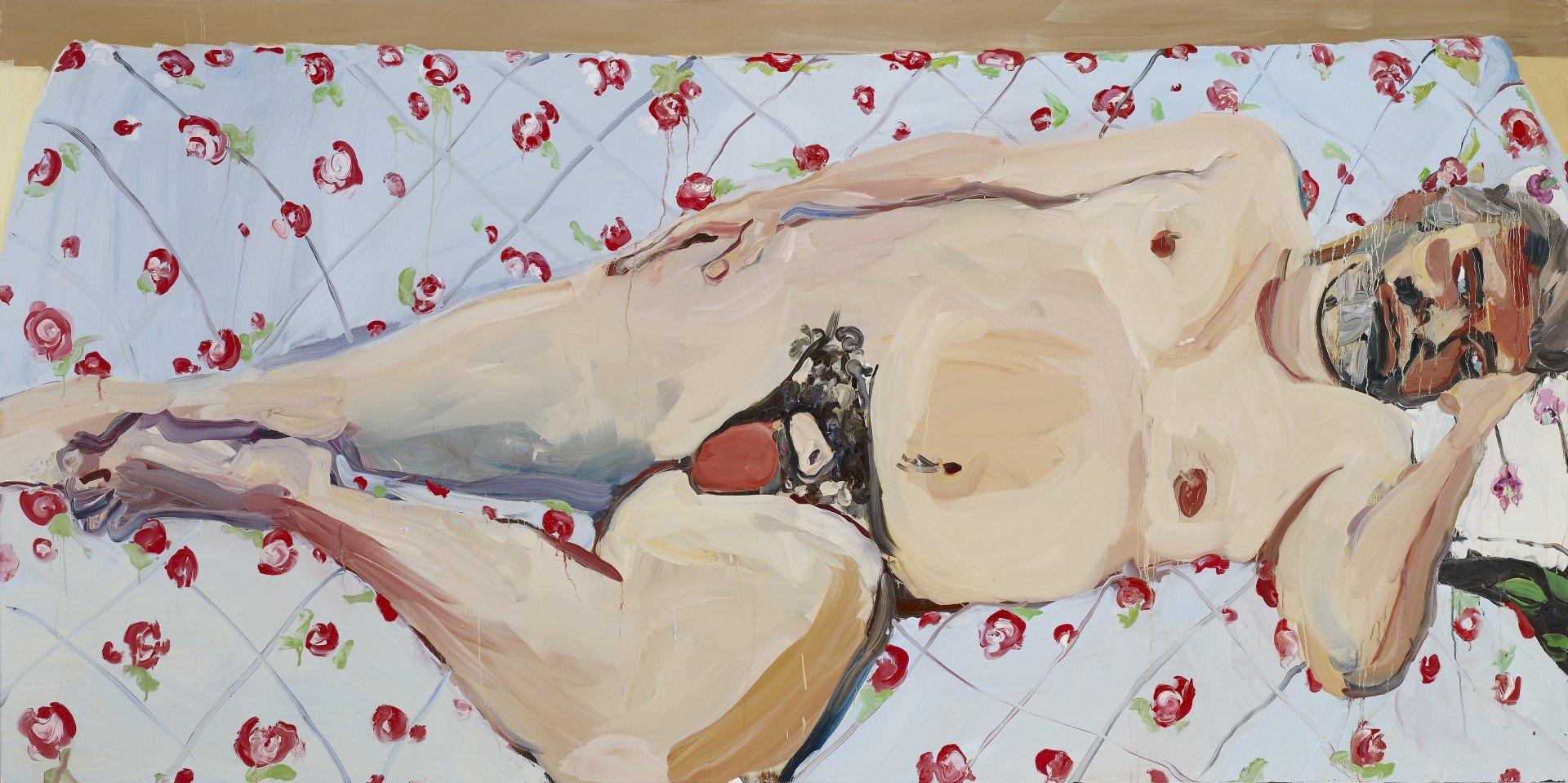 On first entering the Jerwood Gallery, we are confronted by a large (over life-size) oil painting of a naked man. He is laying full length on, what might be, a Cath Kidston floral design duvet cover. This is fellow artist Dan Coombs, Chantal Joffe’s partner. The painting is confrontational, in a direct, literal, ‘nothing to hide’ kind of way. The scene is set.