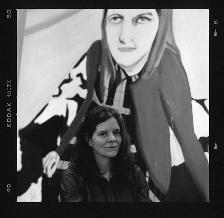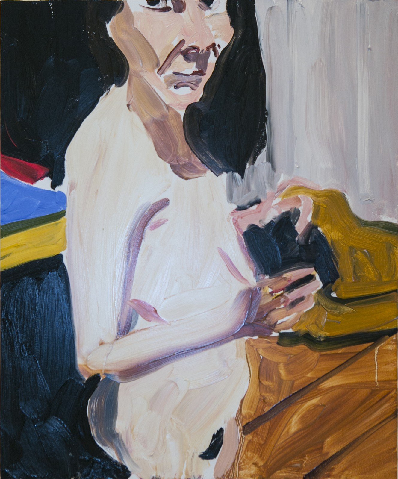 Stylistically, the works are no-nonsense, raw and in your face – so that there is a palpable sense of ‘what you see is what you get’. Referencing snapshot style, off-the-cuff photographs; luscious, creamy paint is applied in broad brushstrokes, mixing wet-into-wet. The work appears almost casually executed, as if it were easily achieved, but of course such deceptively simple paintings never are. In places, the paint drips and splashes, or the turpentine runs, as it should. There’s an almost clumsy honesty in the process and execution. (‘Almost’ because there is nothing unskilled about this painting at all. Joffe, to return to formality, is an Elect member of the Royal Academy and she has received many awards: including the Delfina Studio Trust Award, the Abbey Major Scholarship in painting at the British School at Rome, and the Royal Academy’s Charles Wollaston Award).