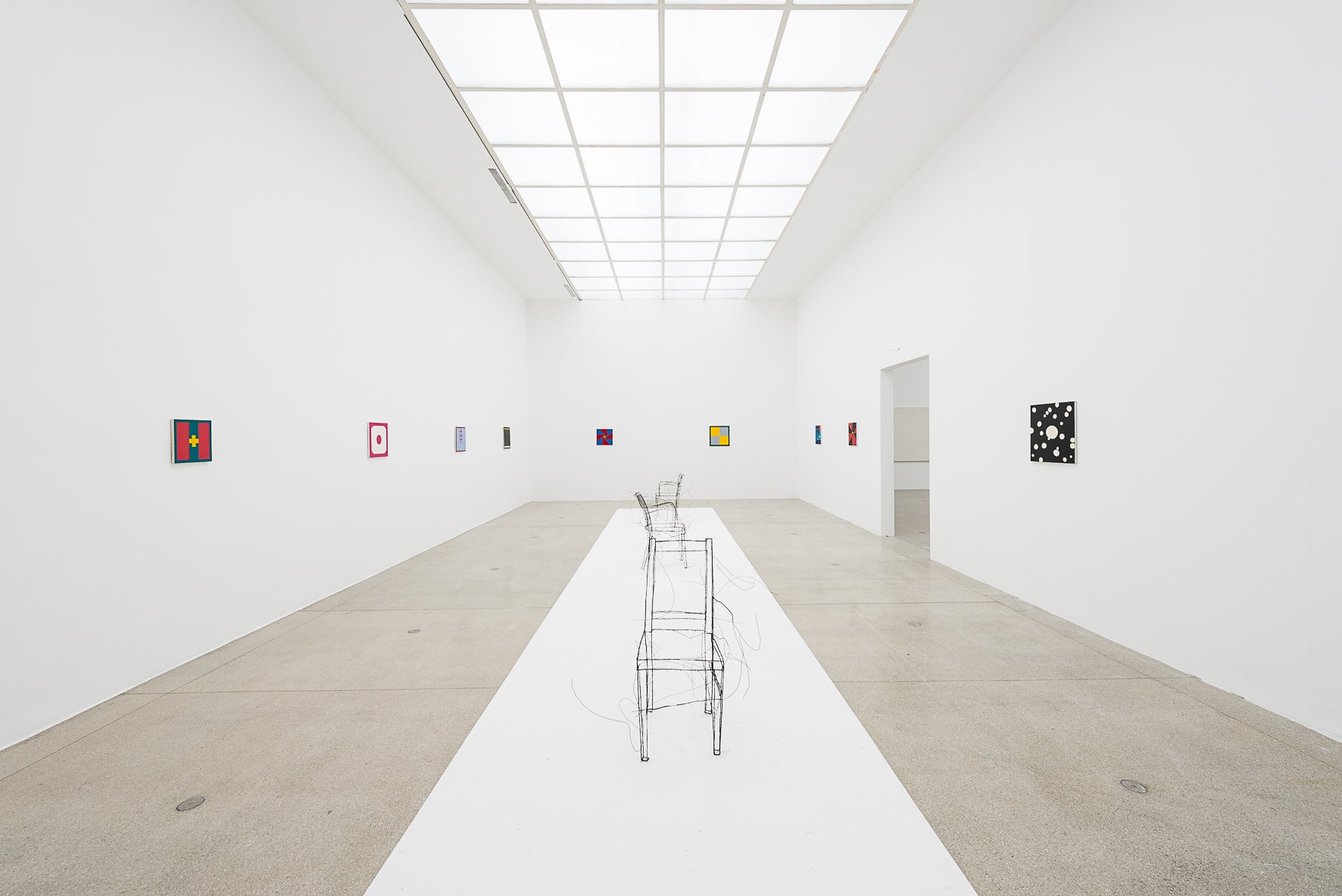In the next room, Ugo Rondinone decided to juxtapose two Austrian artists from different generations. Gerwald Rockenschaub’s geometric paintings that established him as one of the leading figures of New Geometry that took place in Vienna during the 80’s are enclosing a life-sized wired chairs by Fritz Panzer. Panzer’s intention to replace the lines of the pencil with wire and realise three dimensional drawings is not visible from the physical appearance of the work. On the contrary, looking at the reproductions of the sculptures in the catalogue of the show, Panzer’s works look almost like optical illusions.
