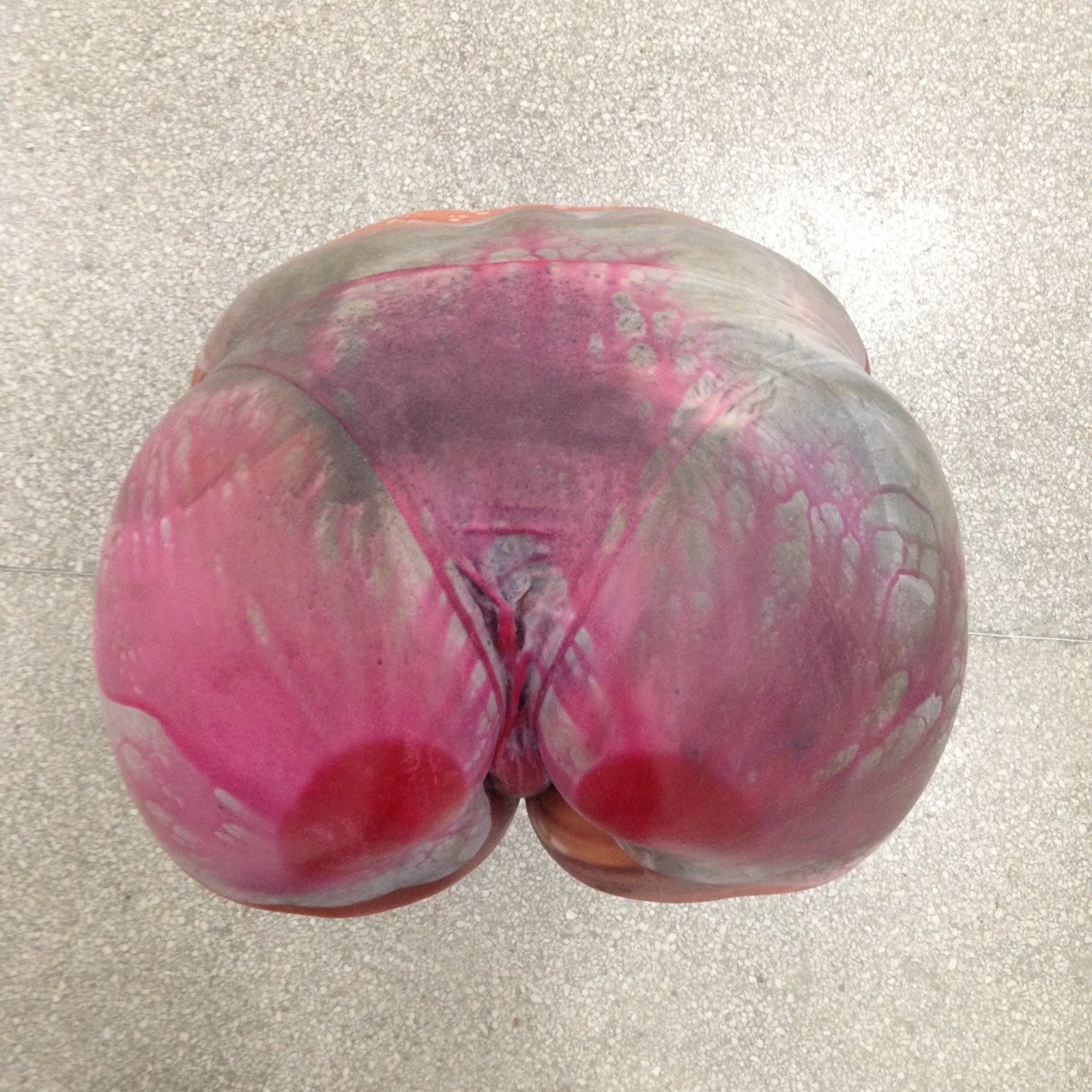 Elsewhere, one could see Tamuna Sirbiladze’s neo-expressionist paintings that were initially presented at the Galerie Lisa Ruyter (2012) pairing up with Fritz Hartlauer’s occultist symbols. The colours, almost absent in the rest of the show, are concentrated in the room dedicated to Andra Ursuta and Michel Williams. Ursuta presents her most recent work, “Waiting Area”, which consists of a series of sculpture with massive casts of the artists behind bearing a variety of colours over them. The artist’s purpose to set against the boundless idealization of the body gets blurry when the subject of the objection is once more an “idealized” butt, even if it belongs to the artist herself.