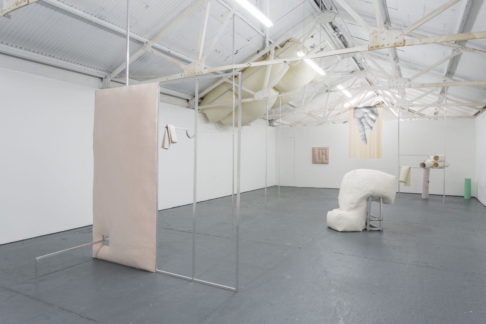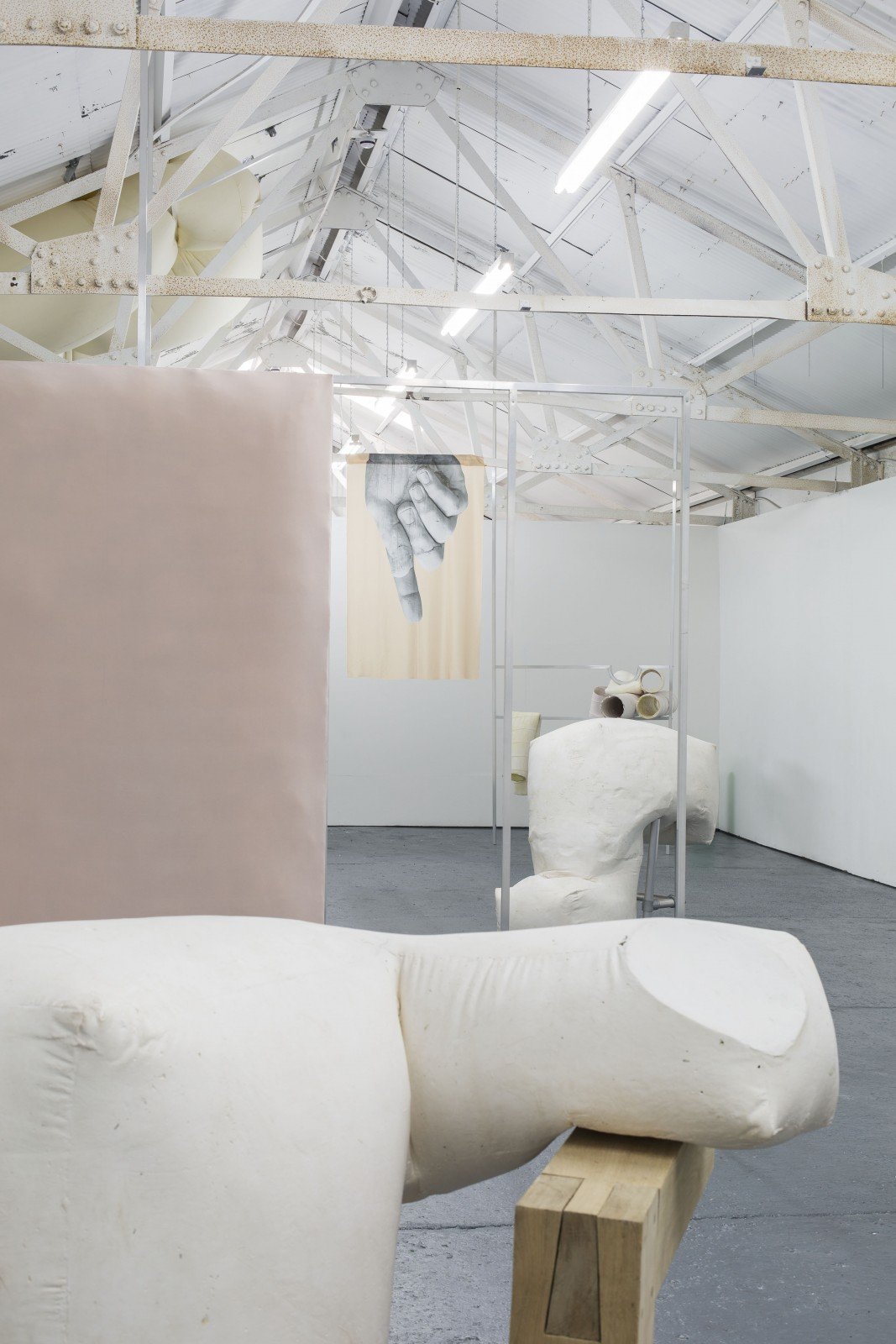 This piece relates a lot to the plaster works I was talking about before. At the time I was making the plaster works I got really obsessed and interested with the Laocoön’s Group and Laocoön’s missing arm. And how it has been reinterpreted over the years by so many different people that has almost become a sort of pop icon. When there is a part missing or when we found a part, we try to construct the rest with our imagination. The plaster works from the hoarders and wasters have these cuts, the holes where which I would go in to cast the works. I covered the holes up and made these slices, like it’s the hidden arm of a classical renaissance sculpture. The silk prints you refer to are digital images of these missing parts. There actually are four in the show; the big hand of Constantine of Colossus, the Laocoön’s arm, a smaller one which is a nose from the Ny Carlsberg Glyptotek Museum in Copenhagen, where a Nasothek collection of the restoration nose are on display. All these noses have their own history and connections to different sculptures which I found really amazing. These silk prints that I have exhibited within the space almost act as flags for the sculptural works, giving hints to the idea of research behind the work itself.