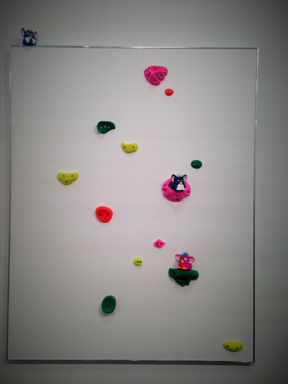 To start with, Brad Troemel at Zach Feuer Gallery decided to let go of putting alive creatures in boxes and espoused the other emerging art trend, that of mounting objects on panels. In the fair he participated with one work from his show “On View: Selections from the Troemel Collection” currently at Zach Feuer. The Wall Mount For Vintage Furby Collections was already sold out before the fair for 12.000$.
