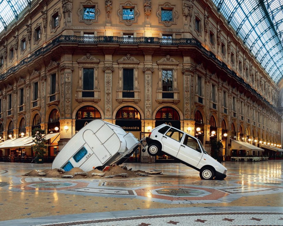 Similarly, the car and caravan by Elmgreen&Dragset placed in 2003 at the centre of Galleria Vittorio Emanuele in Milan – it may be helpful to know that this is a public area daily visited by thousands of tourists – looked like as if they were coming into the real world directly from the underground, likely for a mistake the driver committed. He, and who was with him, were like phantoms restlessly dancing under the mystic gallery dome probably along with the phantom of Giuseppe Mengoni, the building designer, who died on 30 December 1977 falling from the top of the dome soon after the gallery had been completed.