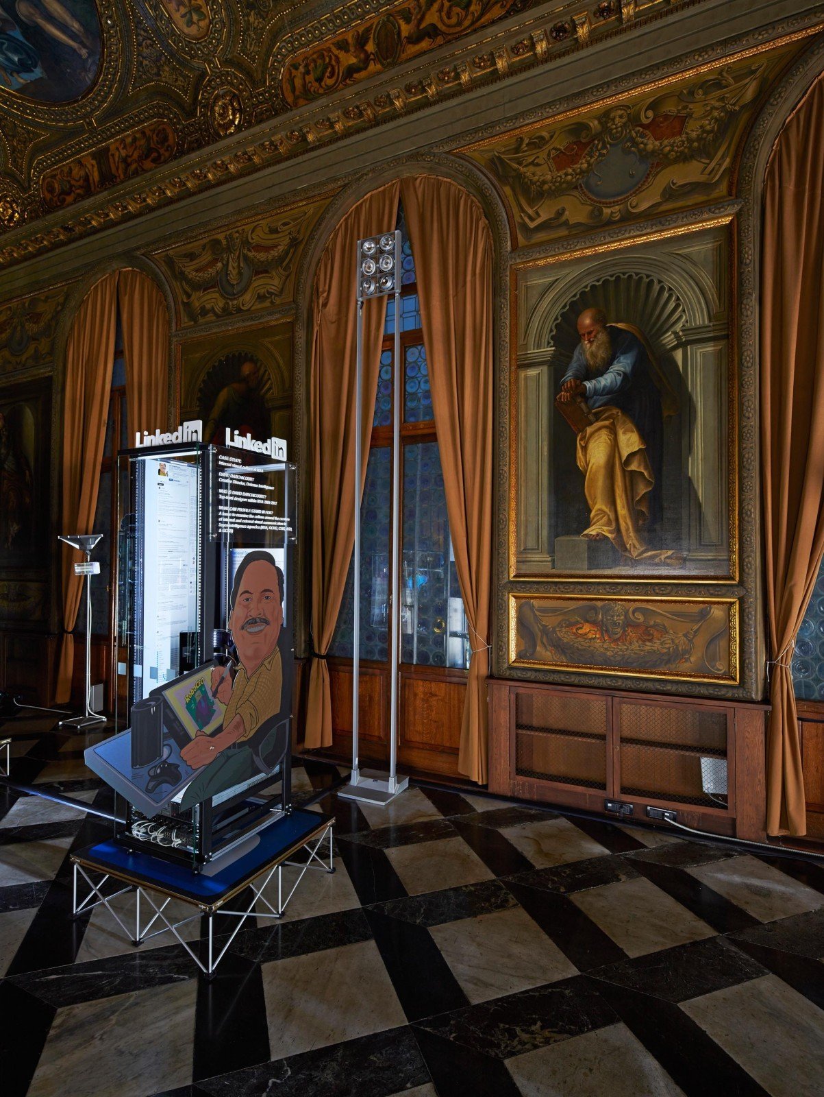 Mr. David Darchicourt, the embodied found online object, exposed by Edward Snowden and reframed by Simon Denny, the designer whose visual creations now speak fundamentally about the world we live in. His self portrait as a cartoonish caricature stands at Biblioteca Marciana next to his diligently updated Linkedin profile printed in plastic. Shame no self portrait by Tintoretto could be borrowed and placed close to this cutting-edge form of self-representation.