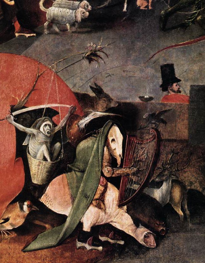 - Hieronymus Bosch, “Triptych of the Temptation of St. Anthony”, 1501 ca., Oil on panel, Museu Nacional de Arte Antiga, Lisbon, Detail of the central panel including the man in a top hat