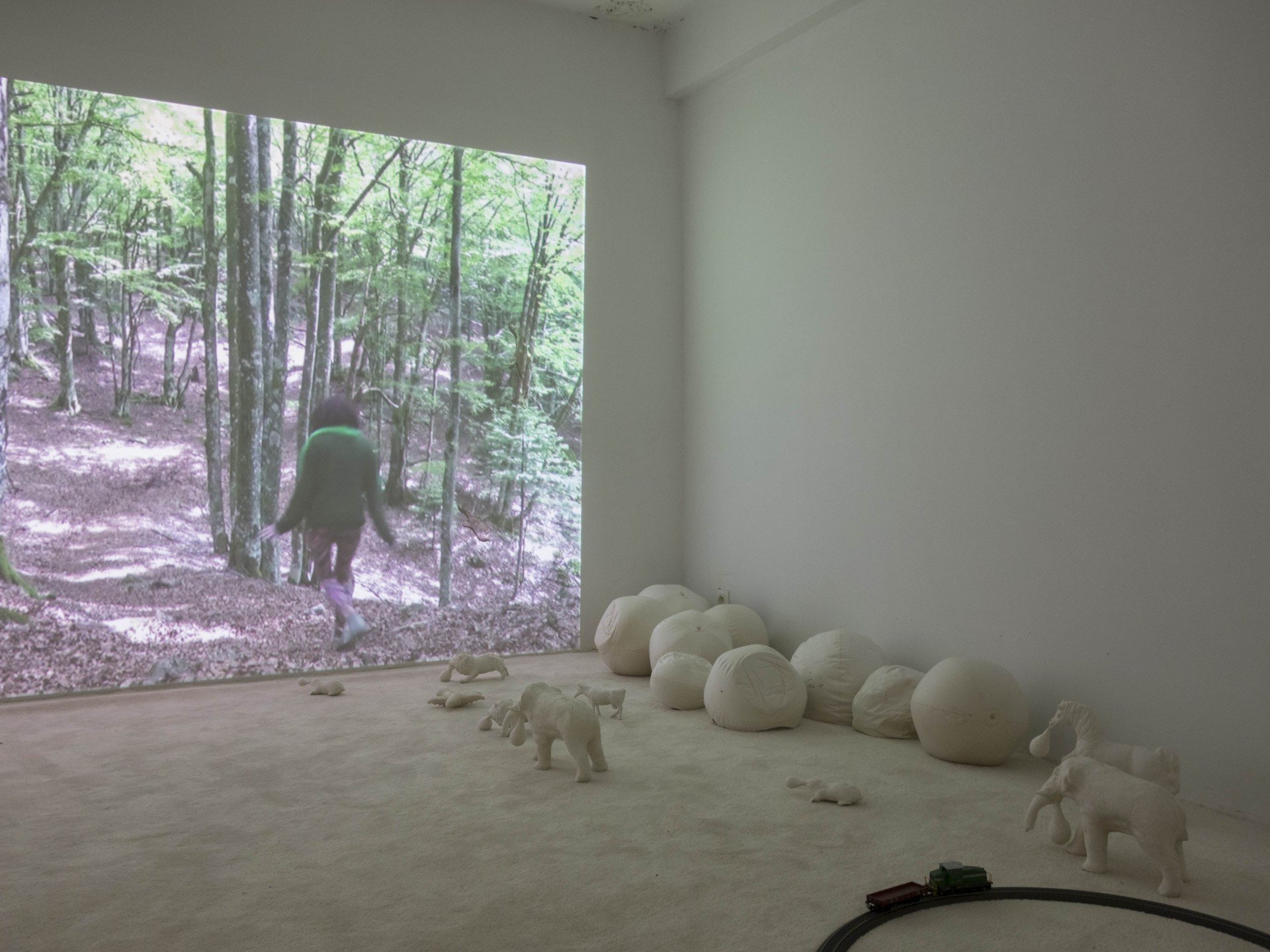 Nothing is natural in this installation: the forest is wild and yet the artist is more present than ever, landed like an alien on her own planet; the sculptures look like the animals they depict and yet they have bizarre bubble-looking prothesis coming out of their mouths, as these creatures were ready to be given (or to take) language and use it in this otherwise very silent “real life” the artist created.