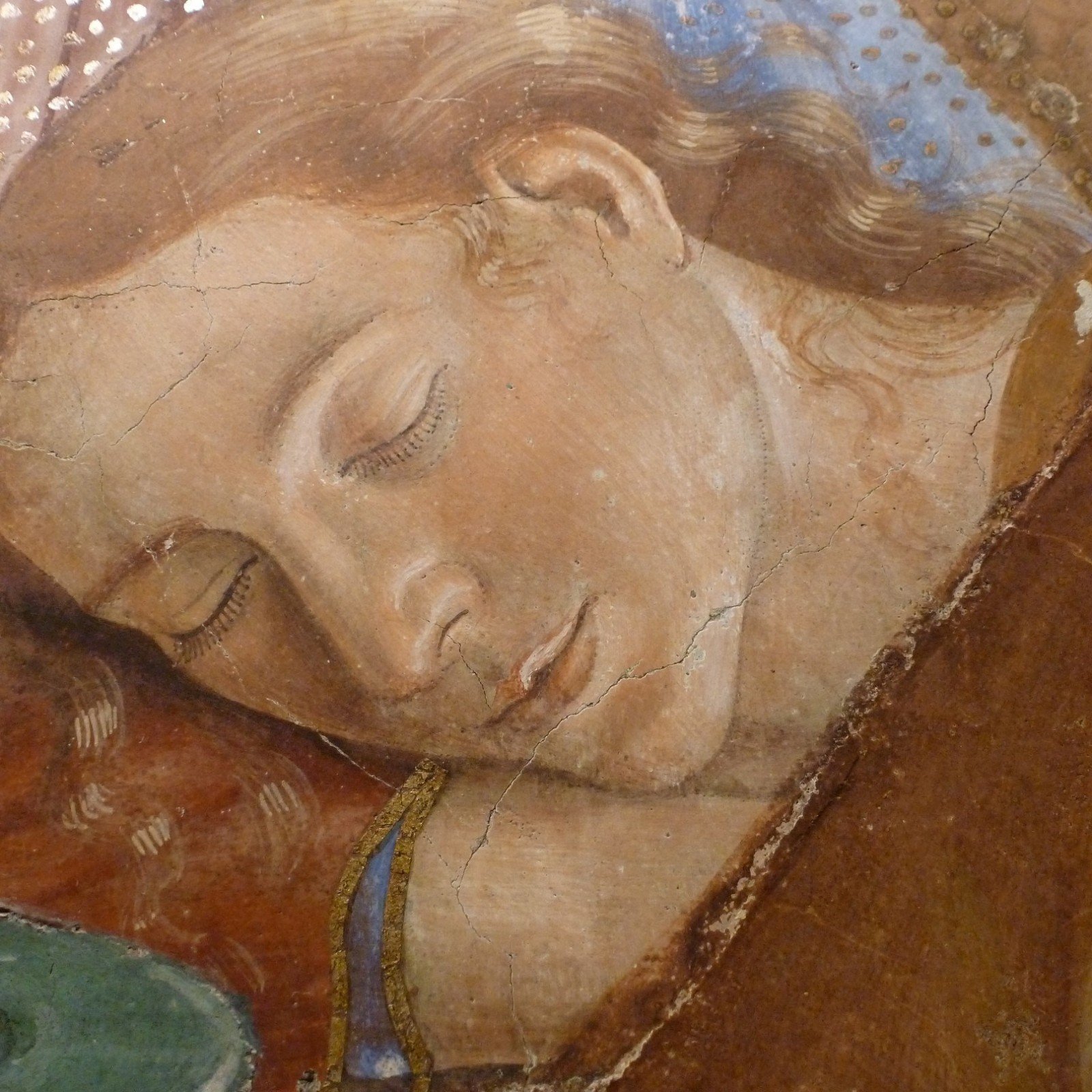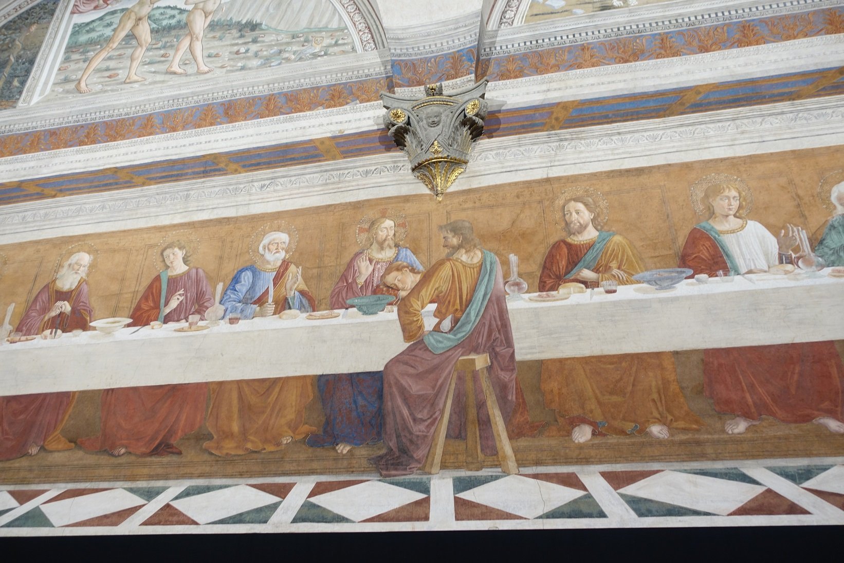 The restoration has brought also to light the similarity between the decoration painted by Ghirlandaio to frame the scene, and that of the marble door of the castle. Along with some of the glasses painted on the dining table, which perfectly reflect the three windows in the room, this detail proves once again the attention the artist always paid to the relation between art and architecture, thus that between the image and its context. In this regards please see also the last supper Ghirlandaio painted for the ‘Cenacolo di Ognissanti‘ in Florence (1480), and that for Church of San Marco (1486, also in Florence), which are probably better preserved and more complex works of art, but with a total different taste from this early experimental work.