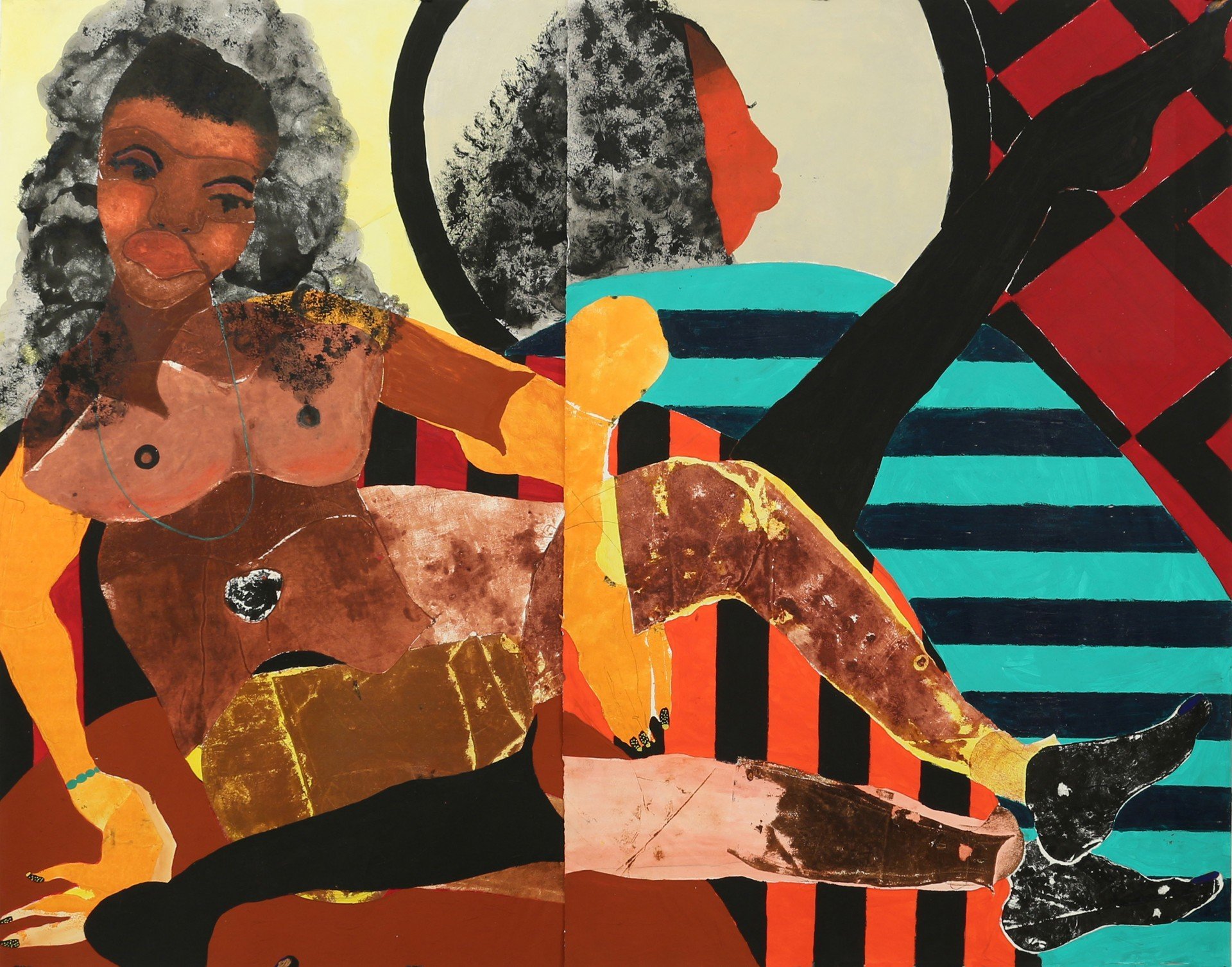 The disembodied eye (the disembodied ‘I’ perhaps) is amongst the most immediately recognisable motifs recurring in Self’s work. Through the printed and repeated eyes of works like Spare Moment, Open, or Pink Eye, the canvas looks back at its viewer. It mutely meets and multiplies the outside gaze. But whose eyes are they that stare back at us from the canvas? Those of the artist? Her subjects? Or are they our own eyes reflected back at us? It is no surprise, given this complex play of gazes, that much of Self’s work brings to mind the fracturing and flattening techniques of the early cubist painters. For the cubists, such a style of depiction was an attempt to show multiple viewpoints on the one object – all compressed into a single picture frame. For Self, these multiple viewpoints stand in for the eyes of varied onlookers, each forming the black feminine body according to their own fantasies. The bodies depicted by Self, therefore, are necessarily fractured. They do not hold the apparent ‘certainty’ of a fixed perspective but are instead assembled by the confluence of cultural projections.