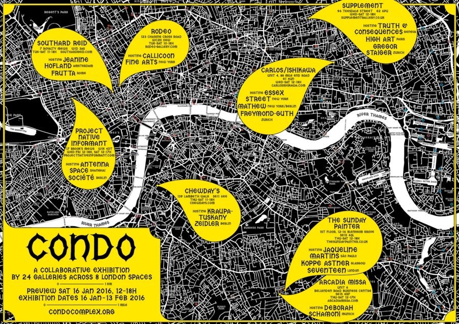 A clever development on the idea of local is Condo Complex, currently on show throughout eight commercial venues around London. For the period of a month, Arcadia Missa, Carlos/ Ishikawa, Chewday’s, Project Native Informant, Rodeo, Southard Reid, Supplement and The Sunday Painter are hosting 24 emerging galleries from Britain, mainland Europe, Asia and the Americas, each of which brought one or two of their artists to these spaces. Carlos/ Ishikawa’s Vanessa Carlos, the mastermind behind the idea, explained in an interview for the frieze blog that the experiment evolved from A Petite Fair, a miniature art fair promoted by Jeanine Hofland since 2012. She continues, ‘I wanted to replicate that generosity and that sense of collaboration, but I knew what wouldn’t work in London was another art fair’. So it came the idea of exchange, allowing international galleries to have a presence in London for a longer period of time than they would during an art fair, yet for a briefer period than if they were to actually open a venue, and either way at a much cheaper cost. By aiming to create ‘a situation where galleries and artists actually have the freedom to experiment’, Condo Complex enables a temporary local, a midway between Harrison’s radical experiment and blue chip dealers Risk-like expansion towards new lands. Galleries have successfully exchanged locations on a one-to-one basis in the past, but the scale and scope of this initiative is unprecedented. It would be interesting to see its model replicated in other localities.