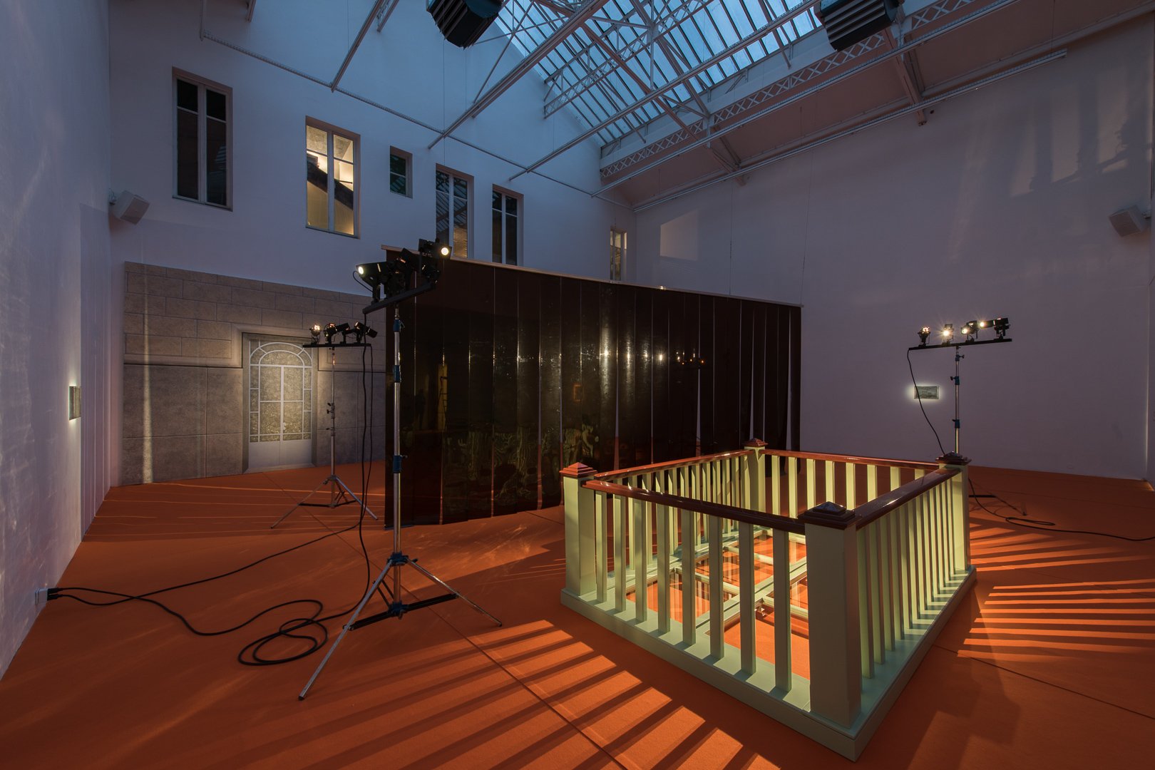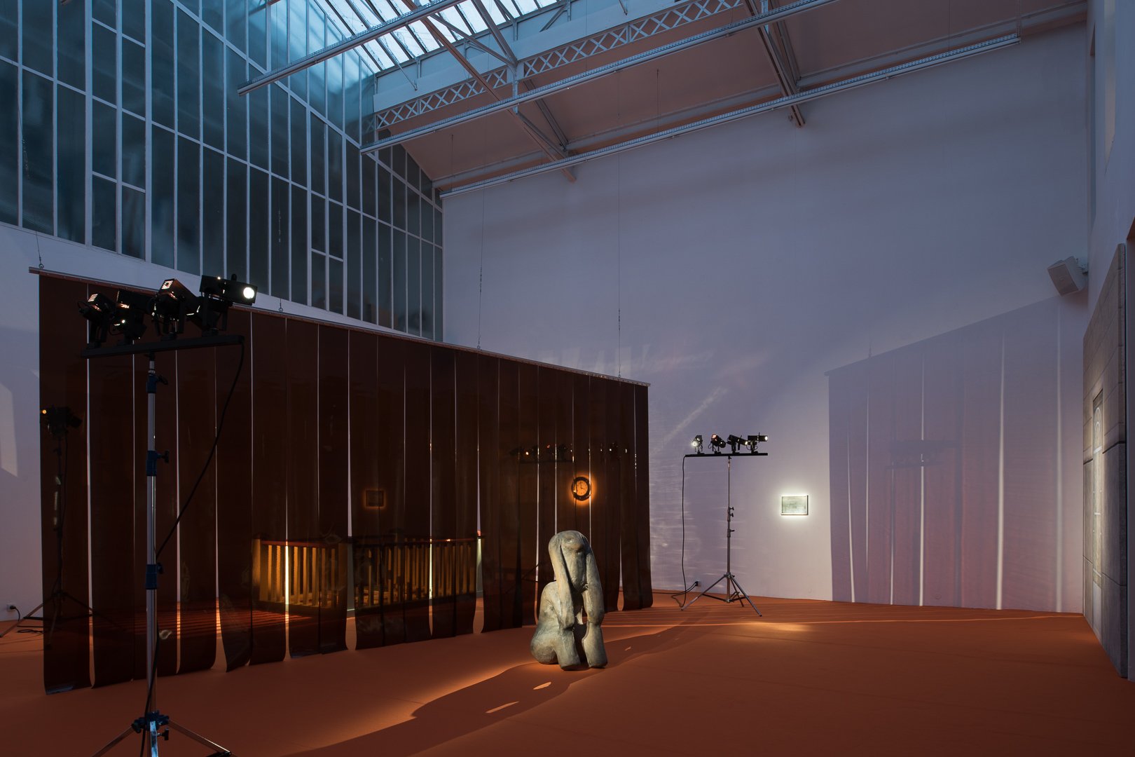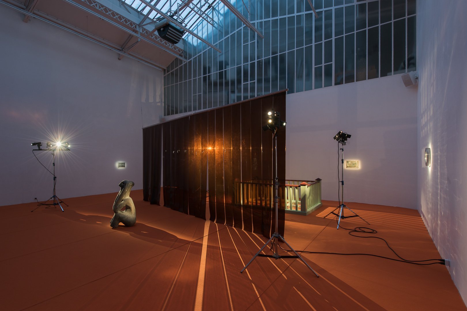– the exhibition gathers together visual metaphors which address specific places, theories and experiences that are somehow to be regarded as intangible elements accurately collected as pieces of a virtual ready made. In regards with the unspoken fil rouge connecting these elements, the beholder is allowed to speculate, for the exhibition’s introductory text produces only the ingredients for the recipe, not the quantities needed, or the indications about how they should be used. On the other hand, the hardware – a gate, a floor window, a curtain, a copy of prehistoric statue, a light stand, a clock, some pictures – composes a sort of tableaux vivant, or still life, merged with the gallery space and animated by artificial lights. In order to mirror the hidden structure possibly supporting this multi-layered interior representation – the orange carpet covering the floor turns the public gallery space into a private one, thus recalling Felix Gonzales Torres to all those who visited his recent show at the New Museum –, we organized a three voices email dialogue where the participants are interviewer and interviewed at the same time.