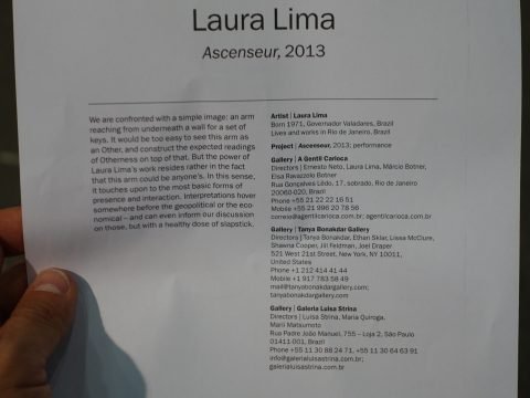 Laura Lima’s installation seems to walk on the same line. A female arm is trying to reach from underneath a wall a set of keys thrown on the floor. You instinctively help the hand to get them (she would not be able to catch the “keys” without your help). You lightly touch her fingers while giving her the keys. She is talking about help and solidarity, and that is what today possibly marks the difference between the art coming from the so-called developed societies and from the developing ones. As a matter of fact extra USA/UK art is generally warmer, politically involved, somehow more human than the one produced in the emerged areas of A(r)tlantis.