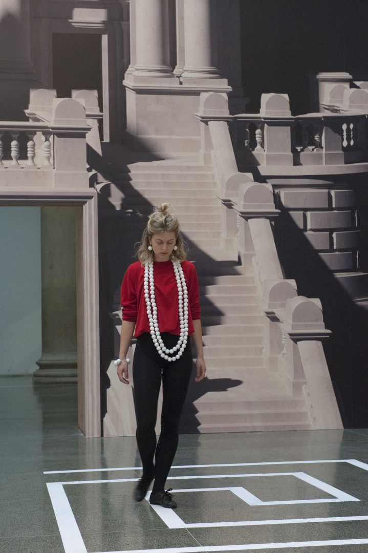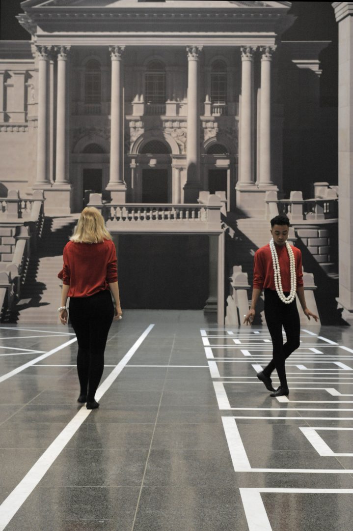 Bronstein’s choreography presents artificial posturing, deportment and unashamed gesture in harmonious relation to the surrounding architectural structure. As a deliberately stylised and sophisticated system of a specific, culturally induced, ‘body politic’ that summons the identity of a particular European class, the result is characterized by a playful or even camp flavour – perhaps to undermine or reveal the falsity of power structures. “It’s a showy art-form and it’s unashamed of excess. This also ties into… queer culture and to a very ironic culture which to someone of my generation, or older, is important, because I grew up – and people certainly who are older than me… grew up assimilating and pretending.”