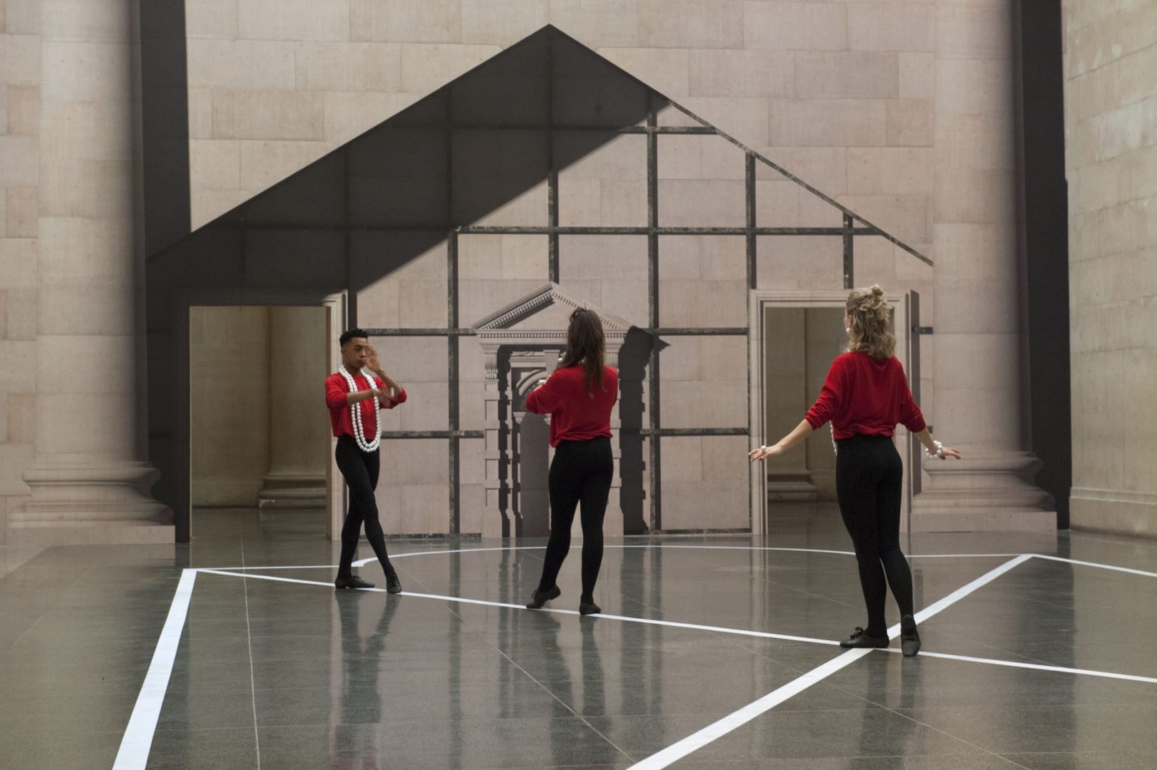 The ancient past, at least of western civilization, is further referenced by the Greek ornamental patterns depicted on the floor. These linear floor plans, made with white tape, create a guiding structure (another drawing of sorts) for the dancers in the promenading space. But the traditional division between performer and audience is broken down as passers-by, whether as interested viewers or not, have to traverse this space to move from one side of the building to the other. The brave walk across the dancers’ space as they perform; whilst the more timid, shy, uncomfortable or considerate, walk around the edges of the space, implying a performative role for all. That the typically ‘English’, undemonstrative and courteous behaviour of today should contrast with the flamboyance of the Baroque may itself give reason to ponder on our social comportment.