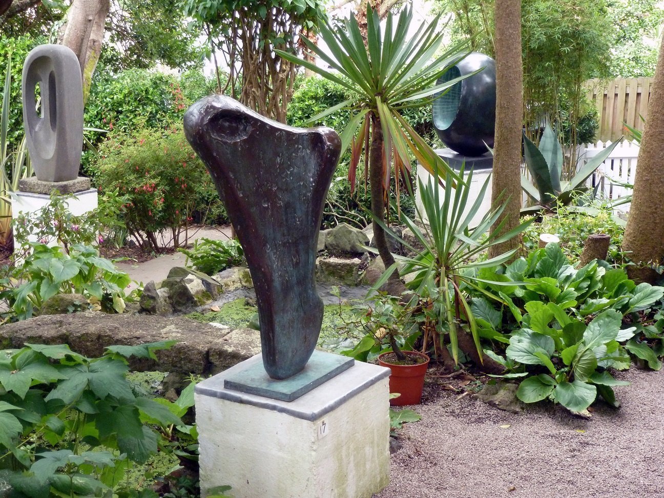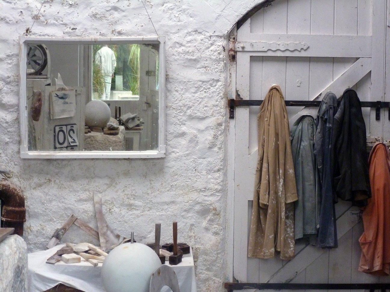 Feeling like a bonus extension to the visit, looking in to the carving and plaster studios attached to the house brings the visitor back to the gallery convention of the showcase. Understandably we cannot enter, but the windows allow a clear viewing of the contents. The carving studio, essentially for stone, has been preserved almost as it was when Hepworth died. Work clothing still hangs from a large door, formerly accessed from a side road. Outside this studio, where we stand, there are blocks of stone made ready to work on – perhaps they were delivered only last week and put into place by the assistants yesterday? Conceptually, these suggest a state of continuity, as sculptures yet to be made. And in the plaster studio, which also retains a sense of still being in use, we see various tools that could have been left as they are the day before. Although, giving a clue to the subtle curatorship, the floor is well swept which hints at the implied theatricality of the scene. Of course, the garden showcases too, but with the element of a more participatory, physical engagement that would have appealed to Hepworth.