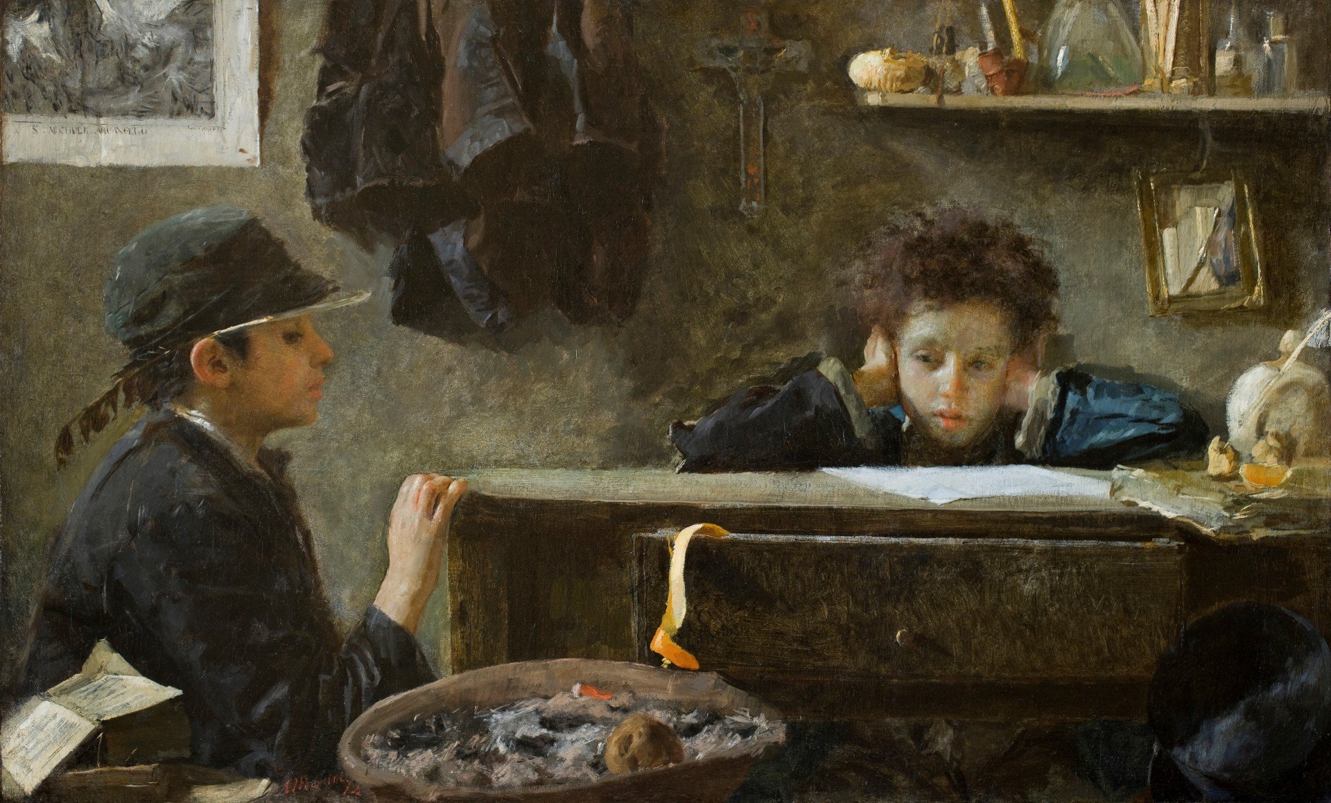 The show at Bottegantica includes some pivotal pieces such as the virtuous self portrait Mancini painted around 1880, probably while he was already suffering of mental disease – the artist spent some months in a sanatorium in Naples between 1880 and 1881. His eyes wide opened, a vibrant corn in his mouth, a sketchbook in his hand, the easel in front of him, and a painting on the background. The artist is surrounded by his obsessions, and draws references to Naples, Alessandro Manzoni, and Mariano Fortuny’s bust sculpted by Vincenzo Gemito. Probably he is looking himself at the mirror, but differently from some of his most effective portraits, his nails are clean, somehow innocent. While, for instance, those of the girl in Two Dolls (1878) are surprisingly dirty and clash with the lavish jewels and precious robe she is wearing. Also the nails of the right hand of Luigi Gianchetti’s portrait are dirty (1878), but not disturbing. favourite Manicini’s model is here simply portrayed as a boy who can’t wait for getting back to more engaging games than practising music, or sitting for a portrait.