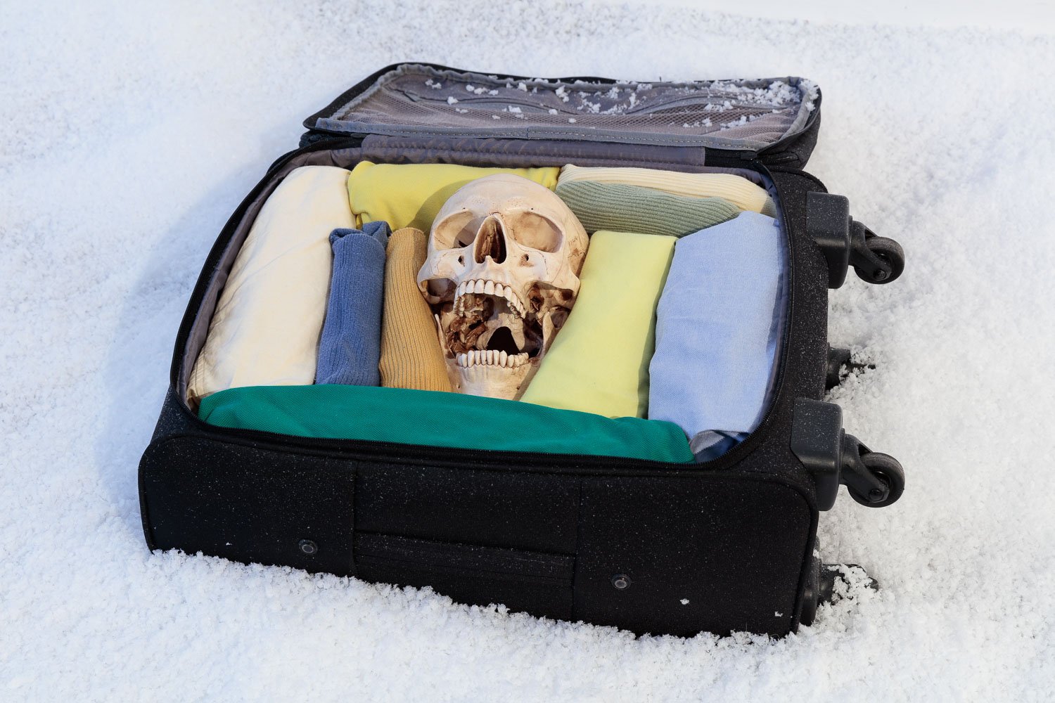 - Puppies Puppies, Baggage (Carry On), 2015, artist and fiancé’s clothing, artificial skull and crossbones, artist’s carry on, suitcase, 55 x 66 x 19 cm, 21 5/8 x 26 x 7 1/2 ins. Courtesy of Wilma Gold.