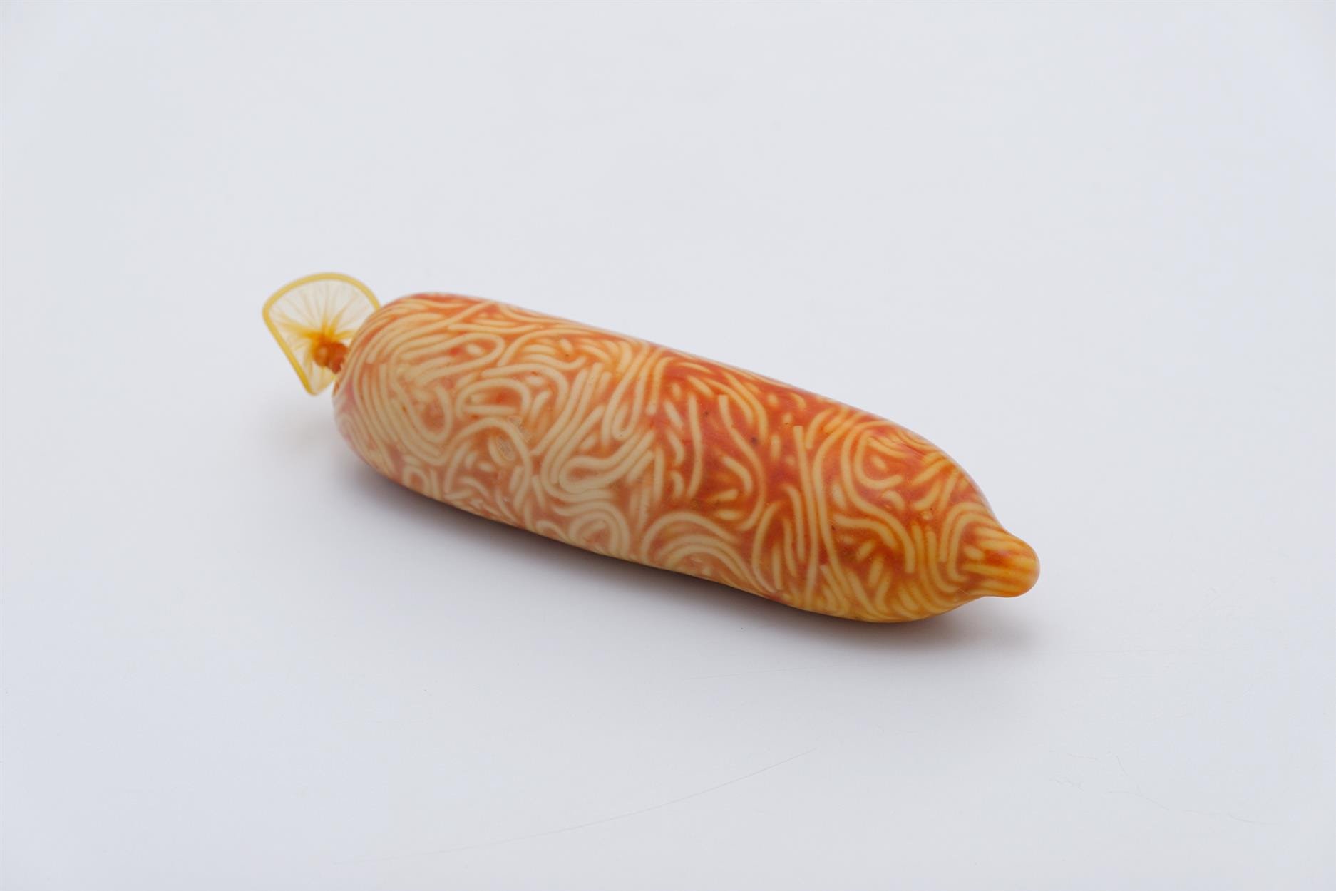 - Puppies Puppies, Spaghetti Condom, 2016, Condom filled with spaghetti, 17 x 5 cm (6 3/4 x 2 in). Courtesy of Balice Hertling.