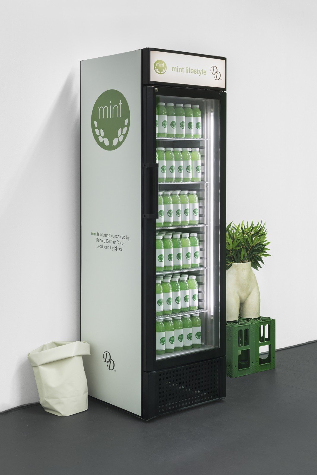 - Debora Delmar Corp., Mint lifestyle (display), 2016. Fridge, plastic bottles, pigment, water, vinyl prints, labels, roll-up bin, silicone, juice crates, acrystal, fiberglass, matcha, plastic plants approx. 200 x 100 x 70 cm. box and sculpture approx. 100 x 40 x 30 cm.