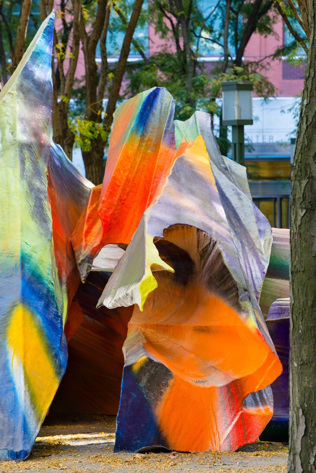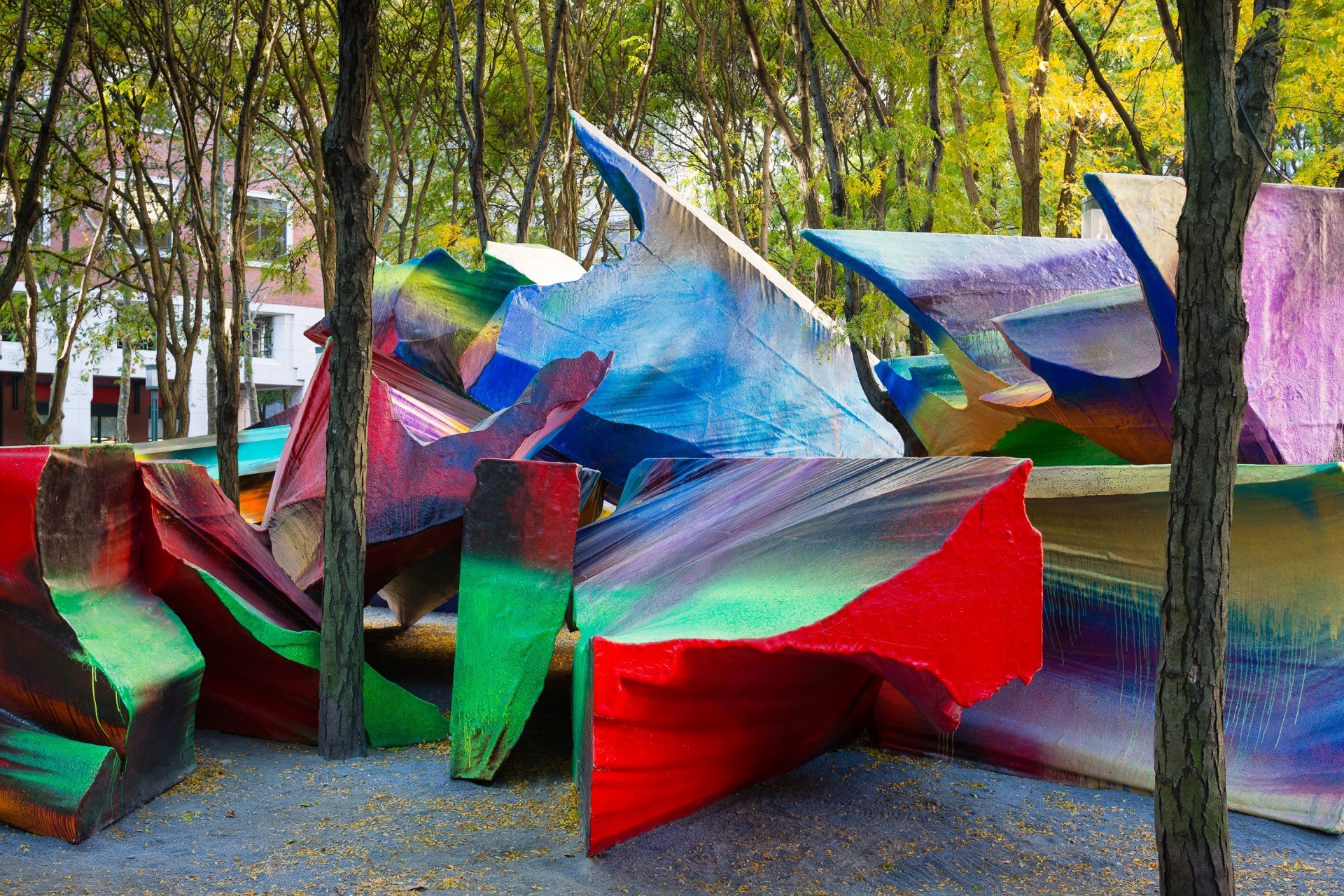 I wanted to have a painting that was sitting on a variety of large particles and for it to be situated in between the trees, so that you couldn’t tell what came first. Were the torn, painted and sculptural surfaces there first or were the trees piercing through the parts? I liked the idea that people could walk through it. I didn’t want it to be an object sitting on a pedestal. I wanted it to seem like it was torn apart, as if it had just been dropped in that little park.