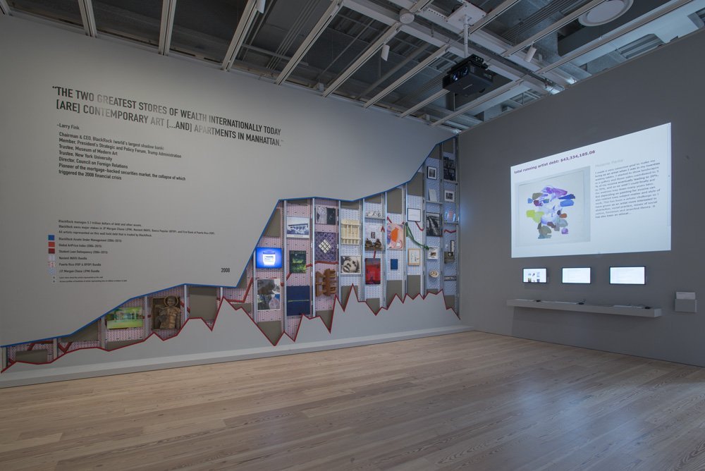 The art collectives exhibiting in the Biennial attempt to give a response. Postcommodity presents a four-channel video of a section of the fence that intersects the U.S.-Mexico border projected on four interior walls of a small room that shows the viewer that fences and walls contains us as much as they keep others out. Likewise, Occupy Museums, a group that grew out of the Occupy Wall Street movement, offers the collaborative installation Debtfair, which display works that can be purchased for the cost of the monthly loan payments of the artists contributing the works to the piece.