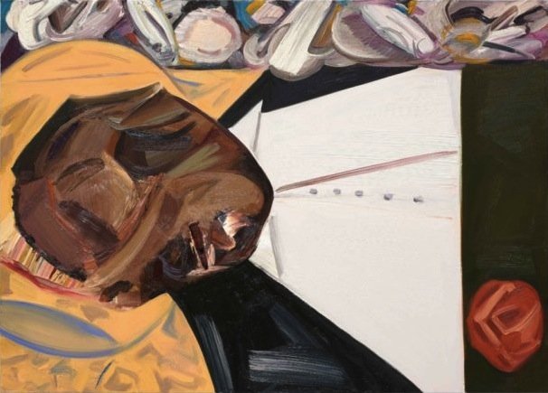 On the other hand, ARTnews editor Andrew Russeth finds the mood of the show “anxious and dark, even sinister, but also, at times, expectant, guardedly hopeful.” One of the most anxiety-producing works in the show is Jordan Wolfson’s violent virtual reality video of a person being beaten bloody in the street to the sound of Hebrew prayers, while two of the most sinister pieces are Henry Taylor’s painting of a black man being fatally shot through the window of his car by a Minnesota police officer and Dana Schutz’ painting of the disfigured body of Emmett Till, a black teenager who was lynched in Mississippi after being falsely accused of flirting with a white woman in 1955.