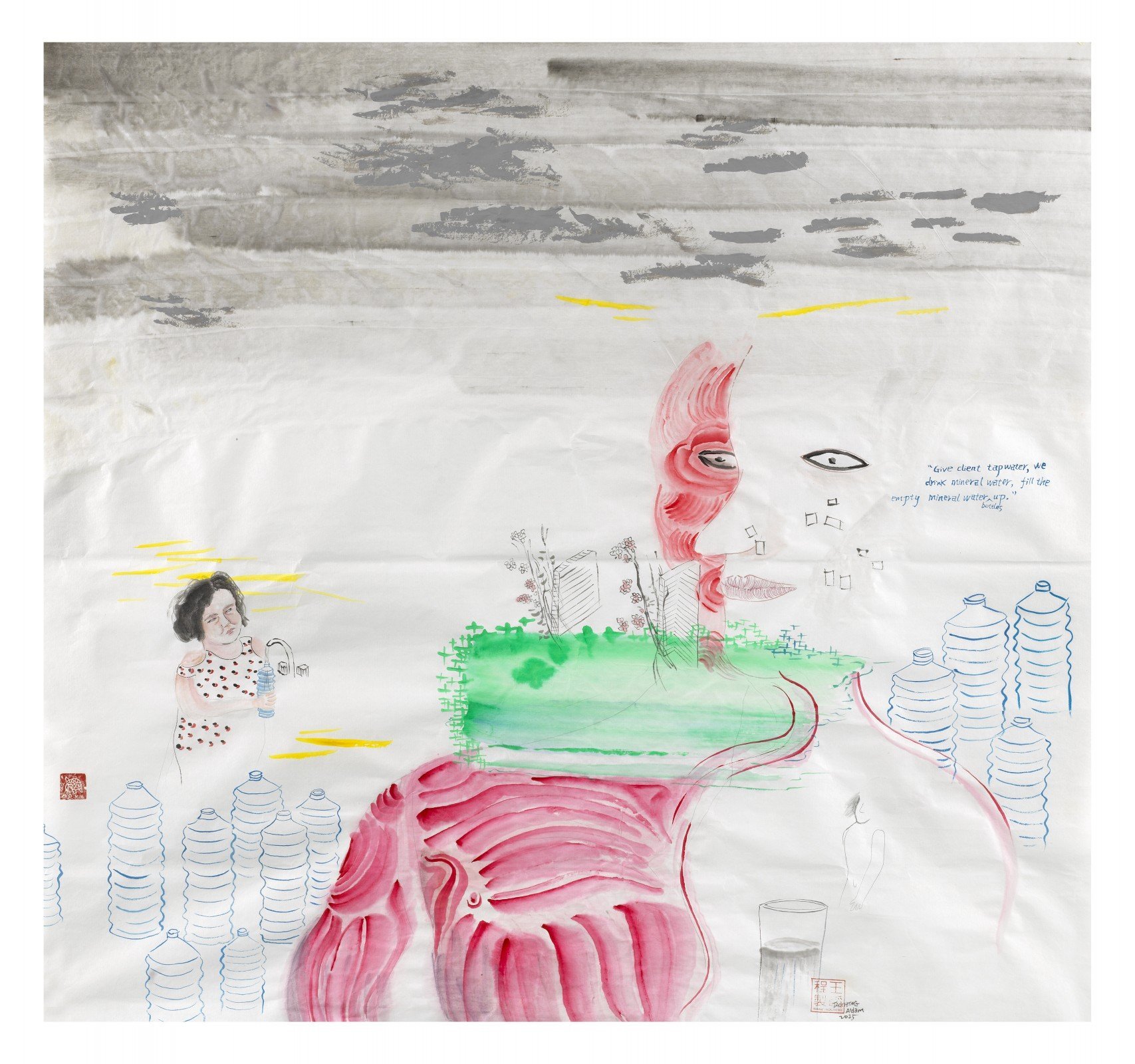 - Taocheng Wang, Give Clients Tap Water, We drink Mineral Water, Fill up Empty Mineral Water Bottle with Tap Water, 2015 Courtesy Galerie Fons Welters.
