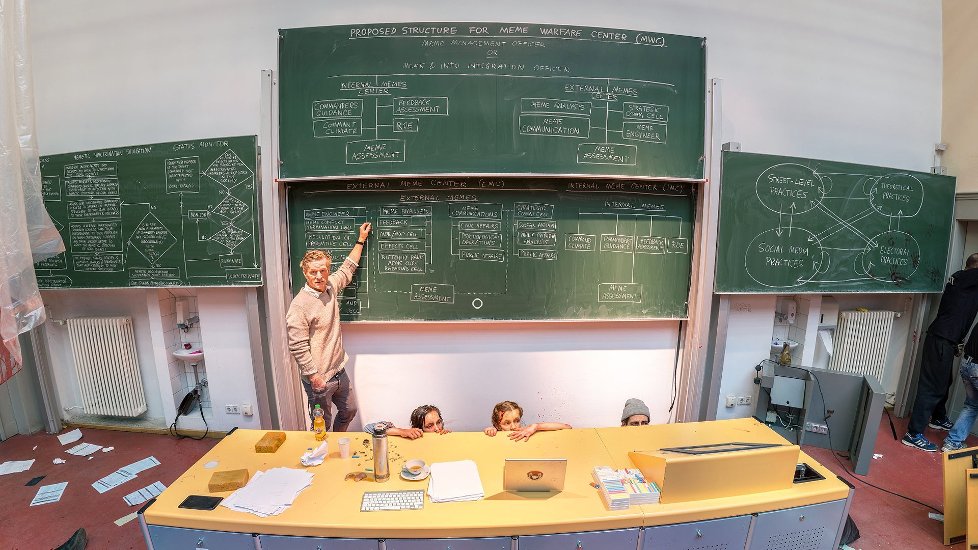 A last point of interest about New Scenario also needs to be mentioned: not many exhibiting situations in contemporary visual art challenge the artists to work with stricter aesthetic and narrative conditions than the “scenarios” determined by the curators of New Scenario. On this point, Barsch and Hornig told us: “We provide the artists with an overall idea of what the project will be like, and sometimes, if we have them, pics of the specific space or setting. The artists are free to develop or contribute whatever work they want. In other cases we directly ask for existing works if we think they fit the concept. In some cases, like in the latest project HOPE [a virtual reality tour of some university spaces in Germany with zombie apocalyptic scenes in which artworks are shown] we offered some artists tighter frameworks, like the development of a chalkboard image or a poster work, or we collaborated with one artist to make a video more site-specific.” It seems more common in other artistic forms for an artist to be asked to deal with challenging artistic conditions. For example, we can think of great filmmakers such as Spike Lee making genre-films (see his bank robbery film “Inside Man”) or architects having to retain some usability in designing visually eccentric buildings. What New Scenario has fruitfully done is having asked contemporary visual artists to embrace challenging restrictions to similar extents and this is a choice we find rather uncommon among contemporary art curators.