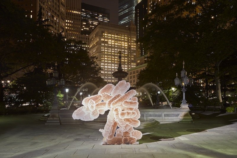 The works that I have been making for the past five years follow similar principles or patterns. I have three types of titles for them and one of them has a relationship to potentiality—a growth potential or the potential of a new frontier in different forms, such as a frontier in space or a frontier in a biological or social process. The other sets of titles are “patterns of activation,” which relate to installations and pattern processing, and “approximations,” that are also about patterns but more about vision, while coming from the idea that a frog is more complex than an iPhone.. For this body of work, which falls into the category of the potentials, I decided to treat the City Hall Park as an alien landing site, where outsiders could look at the Earth as a new frontier, and the potential for within the Earth as to how we see it and what is happening to it, which relates to both social and ecological dimensions. Katja Novitskova