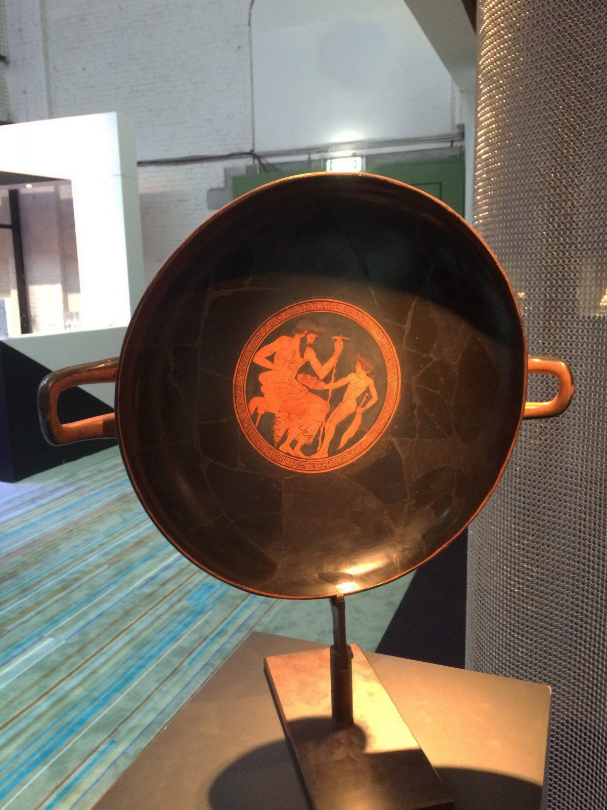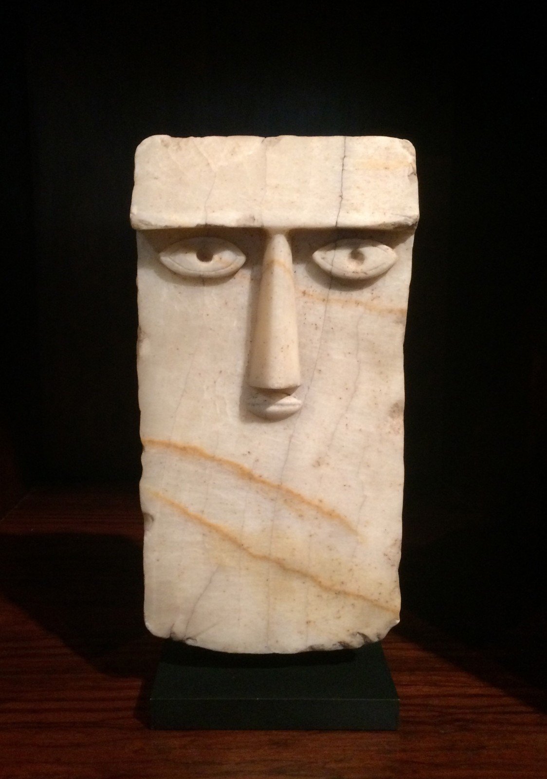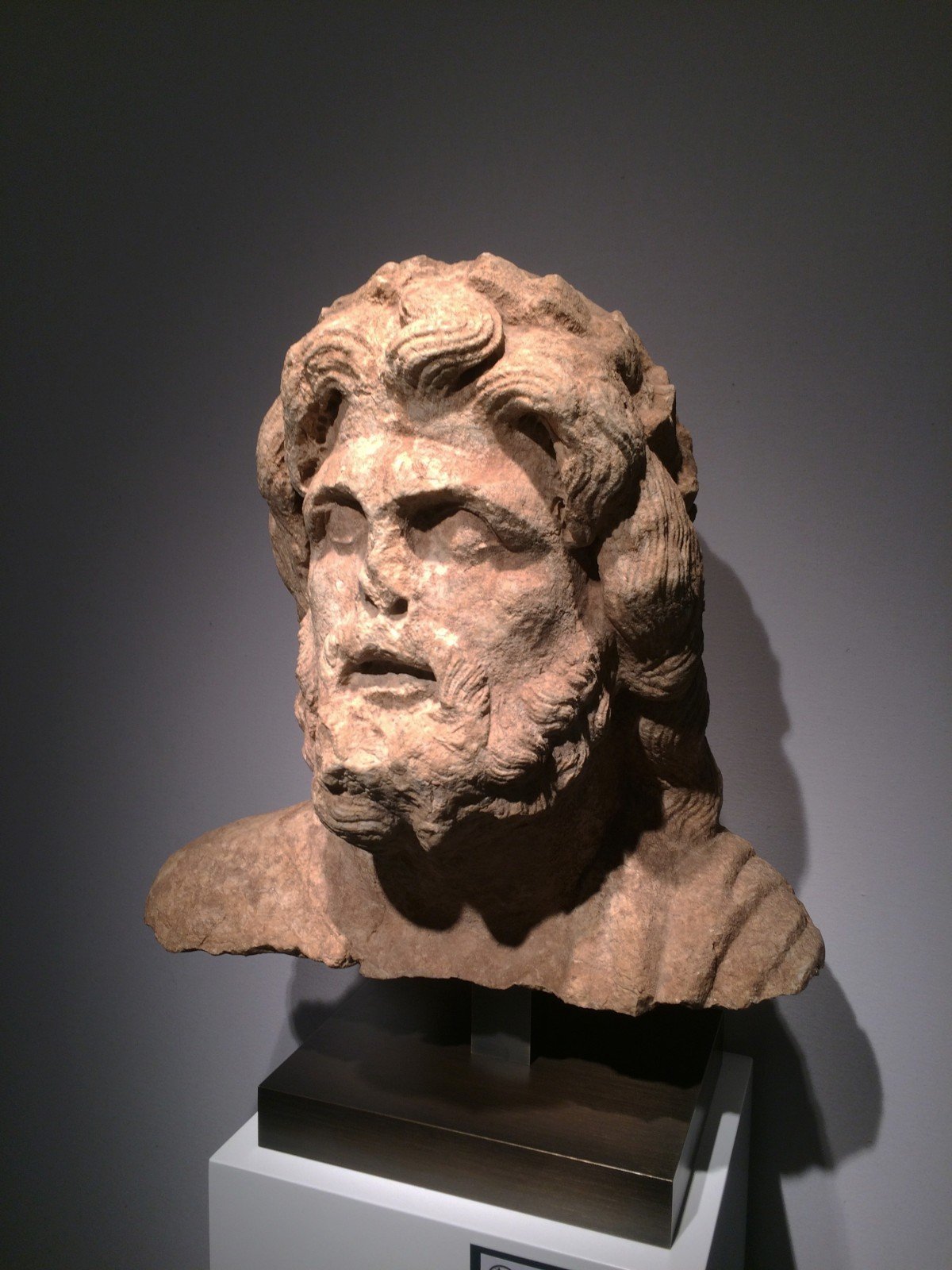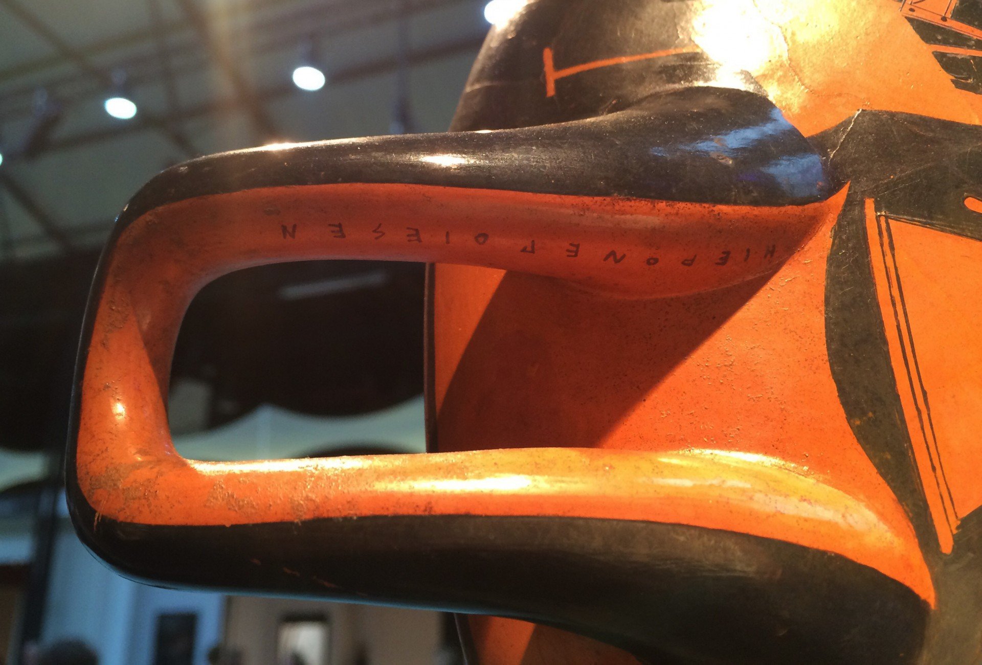 Entering the fair and just reaching the first corner, one could not miss an amazingly restored black-figure vase from 5th BC Attica, placed over a vey special display of steel nets at Phoenix Ancient. We were told that the vase, priced at 190k euros and still available at the time of our visit, was one of the few examples of signed pottery from that period. The handle of the vase indeed bore a little phrase in first-person tense saying “I am made by Hieron”. Not far from Phoenix Ancient and still for the aficionados of Ancient Greek artworks, J. Bagot Arqueologia sold a fascinating monumental head of the Greek god Sabazios for an undisclosed price.
