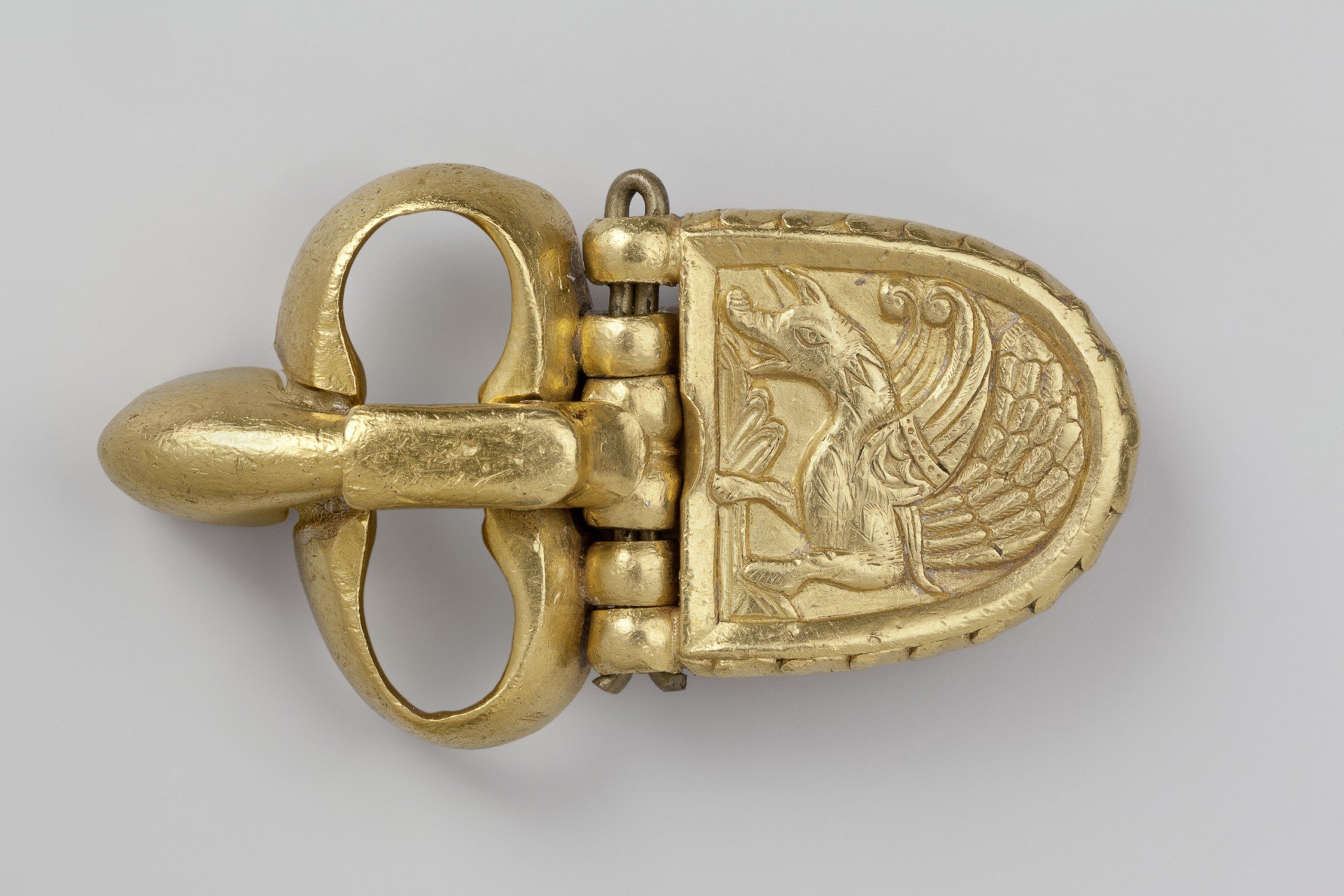 - Golden belt buckle showing a griffin with predator body, wings and peacock’s tail, locality unknown, around 600 / 1st half of the 7th century AD, © Roman-Germanic Museum / Rheinisches Bildarchiv Köln, photo: Anja Wegner.