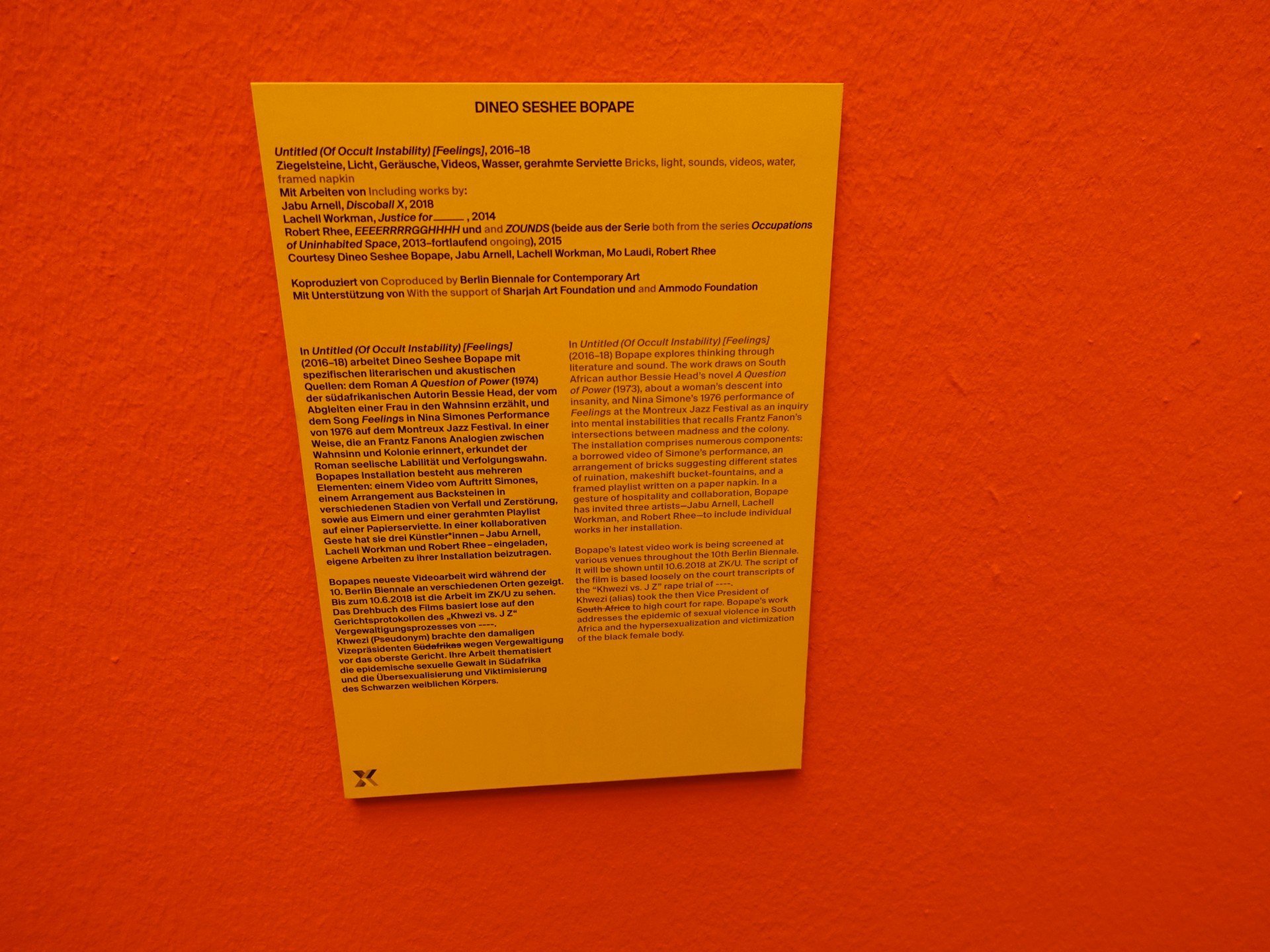 E in questa costellazione di senso la prima stella a brillare è quella di Dineo Seshee Bopape, già vincitrice lo scorso anno del Future Generation Art Price e del Sharjah Biennial Prize. L’installazione con cui partecipa alla decima Biennale di Berlino, già presentata nel 2016 al Palais de Tokyo, occupa l’intera aula centrale del KW. L’artista, pure sudafricana, l’ha trasformata in un enorme fucina di luce arancione dove tutto crolla e si rigenera in brevi episodi di vita. Il titolo, Untilted (of occult instability)[Feelings] si riferisce agli studi dello psichiatra martinicano Frantz Fanton, teorico dei traumi psicologici causati dal colonialismo. Parte della narrativa dell’opera sono anche la toccante autobiografia di una scrittrice fondamentale per la cultura post-coloniale come Bessie Head – nata nel 1937 da una relazione allora illegale tra una ricca donna bianca sudafricana e un domestico di colore –, e la cantante Nina Simone, di cui Bopape riscopre la memorabile (davvero) esecuzione di Feelings durante il Montreux Jazz Festival del 1976. Il resto sono laterizi sbriciolati come fossero biscotti, colonne cadute, una grande sfera di cartone che penzola dal soffitto (dell’artista Jabu Arnell), e opere di altri due artisti invitati da Bopape, ovvero Lachell Workman e Robert Rhee (sono di quest’ultimo le piccole sculture che potrebbero vagamente ricordano interiora umane o parti di cervello). È proprio questa la tragedia che stiamo ancora vivendo? Forse sì. E se anche l’approccio citazionista di Bopape ricorda molto quello Goshka Machuga, rispetto a questa l’artista sud africana pare avere obiettivi espressivi più chiari, e per questo risulta più leggibile. Lo dimostra anche il caleidoscopio di danze e immagini allusive che Bopape mette in scena per il video in mostra allo ZK/U, una delle quattro sedi espositive della Biennale (Not yet titled, 2018). Qui l’artista si riferisce al controverso processo che nel 2006 ha visto l’ex presidente sud africano Jacob Zuma accusato di stupro dell’attivista Fezeka Khuzwayo, nota come Khwezi, morta nel 2016 di AIDS a soli 41 anni. Di nuovo, Bopape prende a soggetto un fatto storico e lo rappresenta affinché il suo significato possa continuare a riverberare, come si trattasse di un monumento.