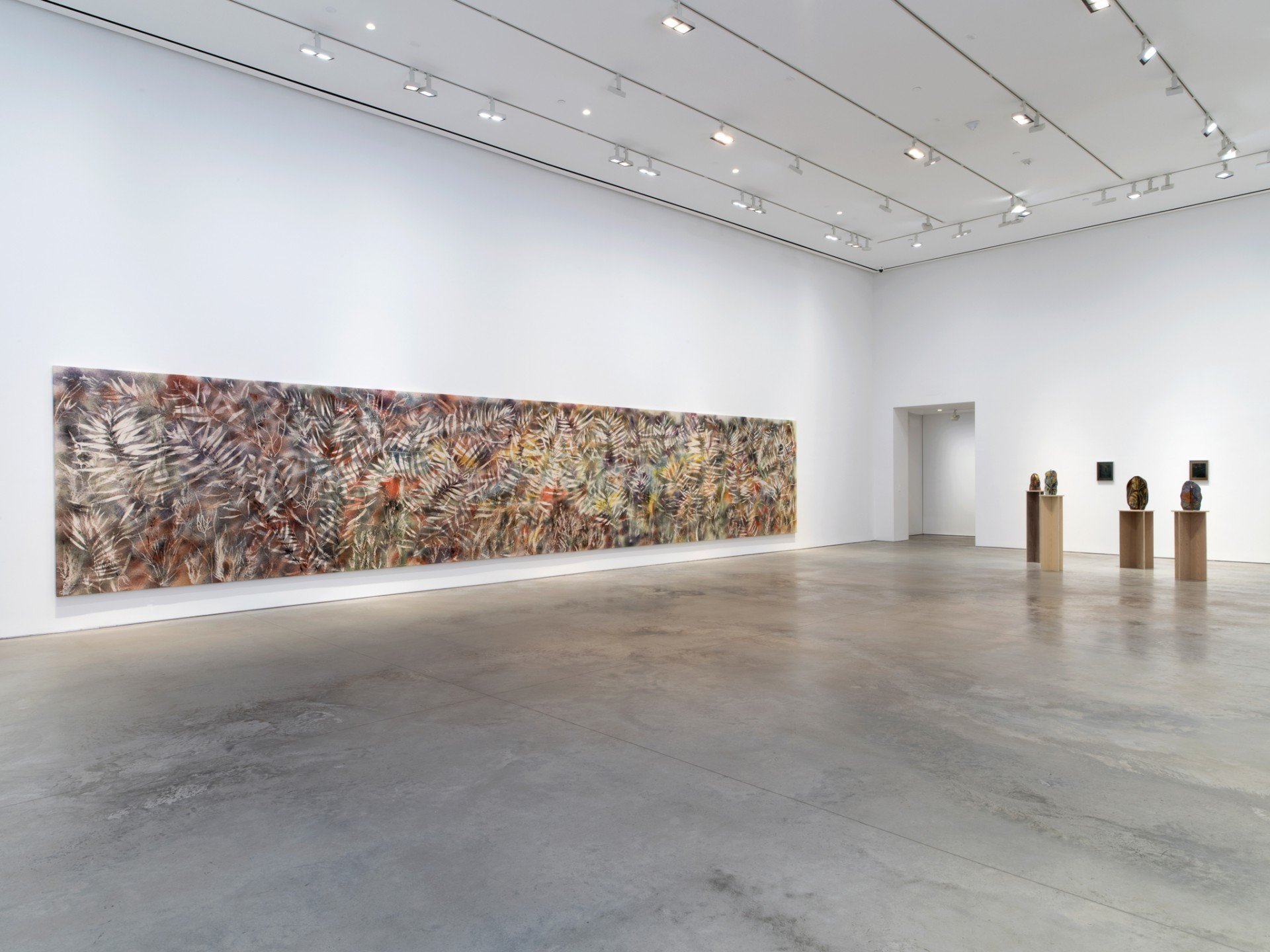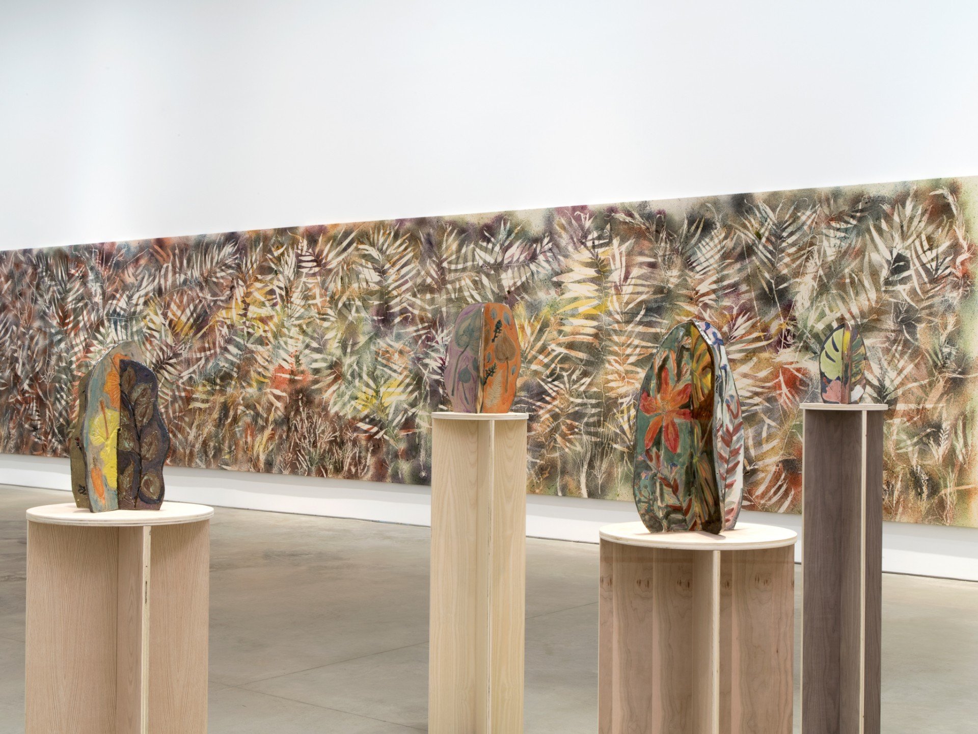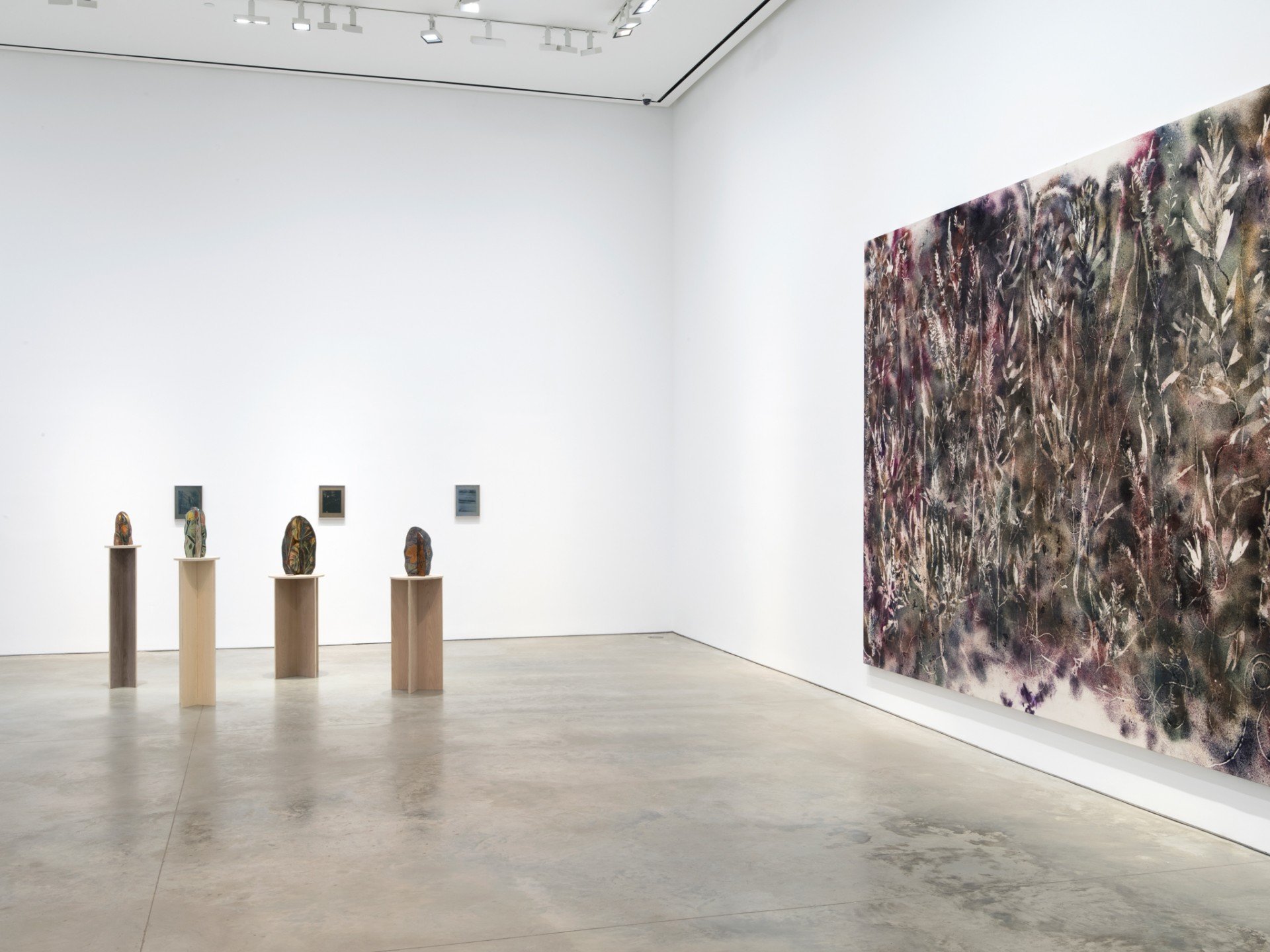 Mentre questo dipinto è brillante e fluido – con le foglie d’alga che danzano in un campo di colori accesi –, le terza tela in mostra è più scura e volubile. Generata in una notte di pioggia nei boschi dell’Arkansas, Untitled (Ozark National Forest, 1) cattura una giostra di piccoli fiori e foglie su uno sfondo di sbaffi marroni, bordeaux e verdi. Questo dipinto, che può ricordare la palette scura e quasi nebbiosa di Mark Rothko, oppure la lirica dei colori pastello di Odilon Redon, è la perfetta unione fra astrazione e rappresentazione; e ci riporta ai dipinti sublimi che Yves Klein ha ottenuto legando sul tetto della macchina tele colorate mentre viaggiava da Nizza a Parigi sotto la pioggia.