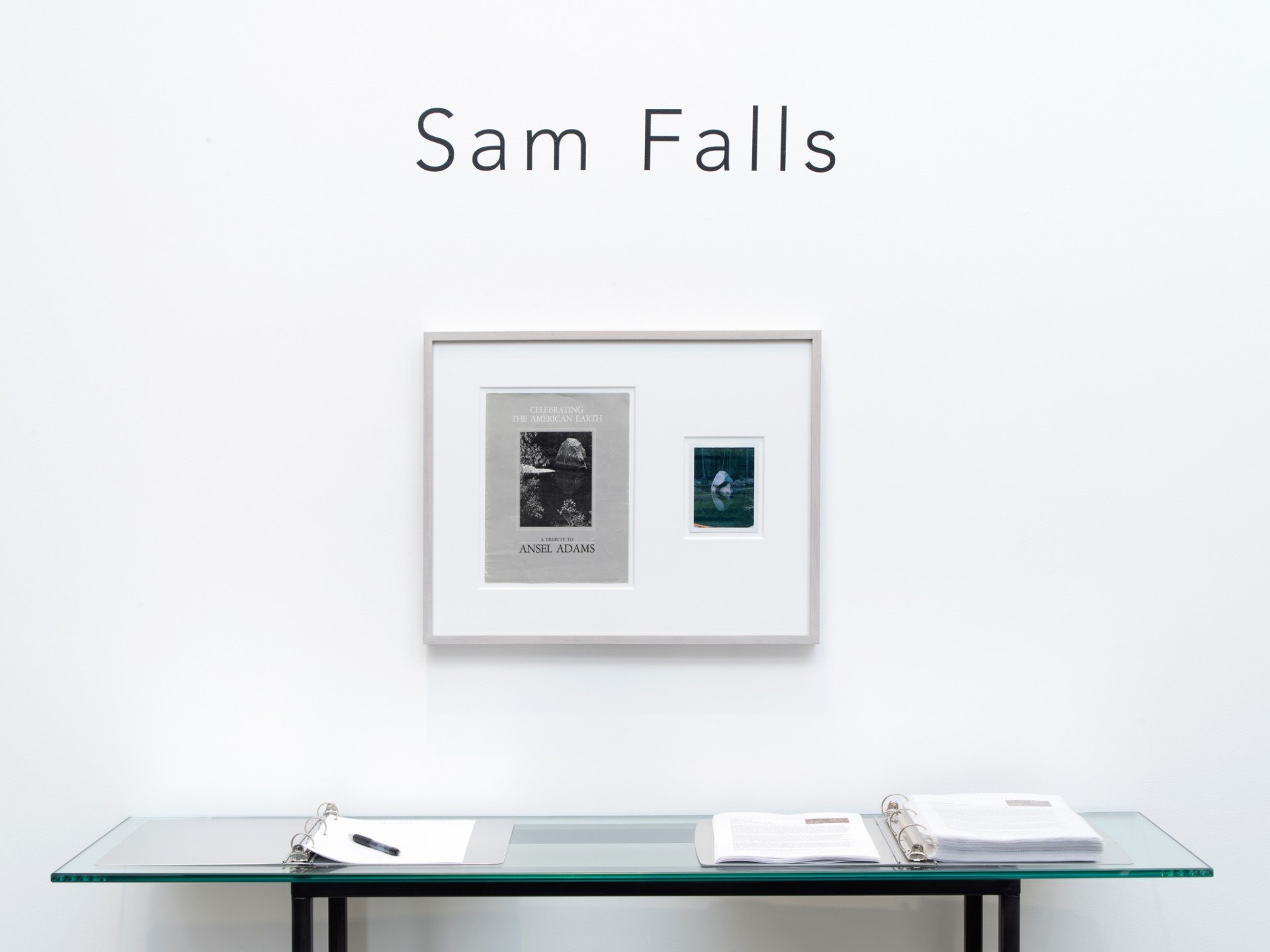 Il collage ‘montato’ in cornice si intitola Untitled (Rock, Merced River, Autumn, Yosemite Valley 1962-2015). Affianca a una Polaroid scattata dall’artista una copertina di Celebrating the American Earth: A Tribute to Ansel Adam, pubblicato per la prima volta dalla Wilderness Society nel 1980. La pietra nel fiume ritratta nella fotografia in bianco e nero del 1962 che appare sulla copertina del libro di Adam è la stessa pietra del fiume Merced che compare nella fotografia scattata nel 2015 da Falls, che vuole così rendere omaggio al coinvolgimento creativo di Adams con la natura, e allo stesso tempo costruire e trasformare il passato.